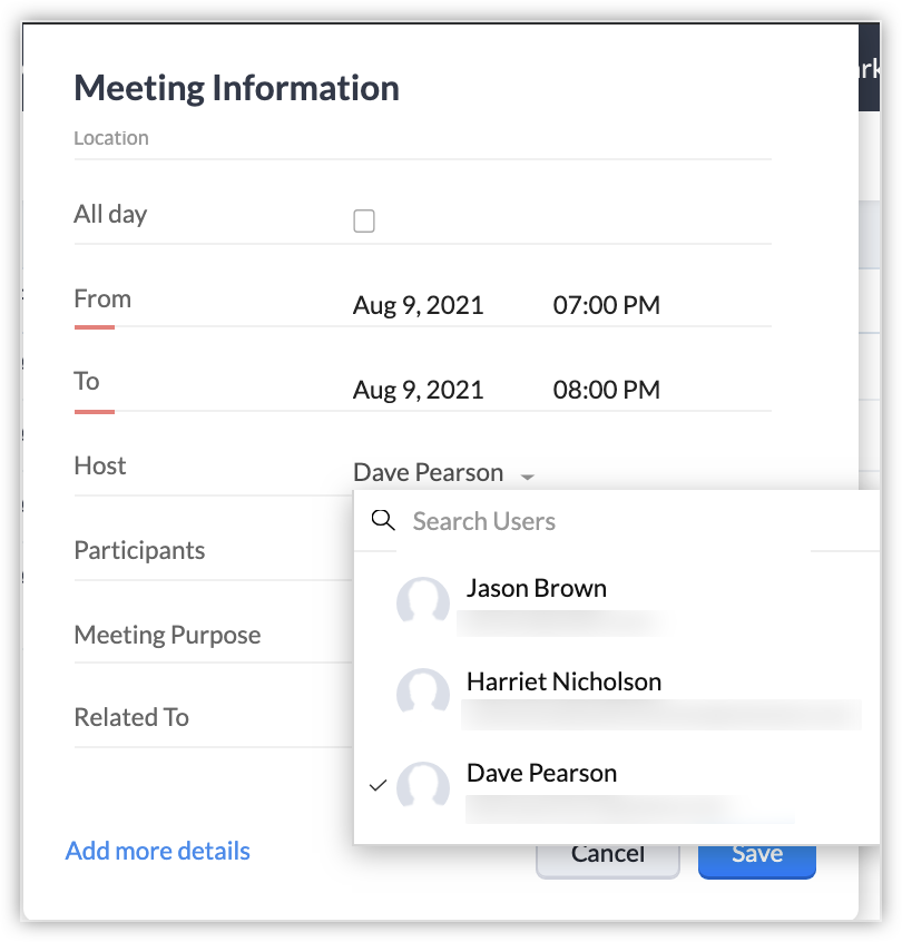 You can only create meetings for other users if you are a CRM admin . For meetings, you can select the host from the list of other users.