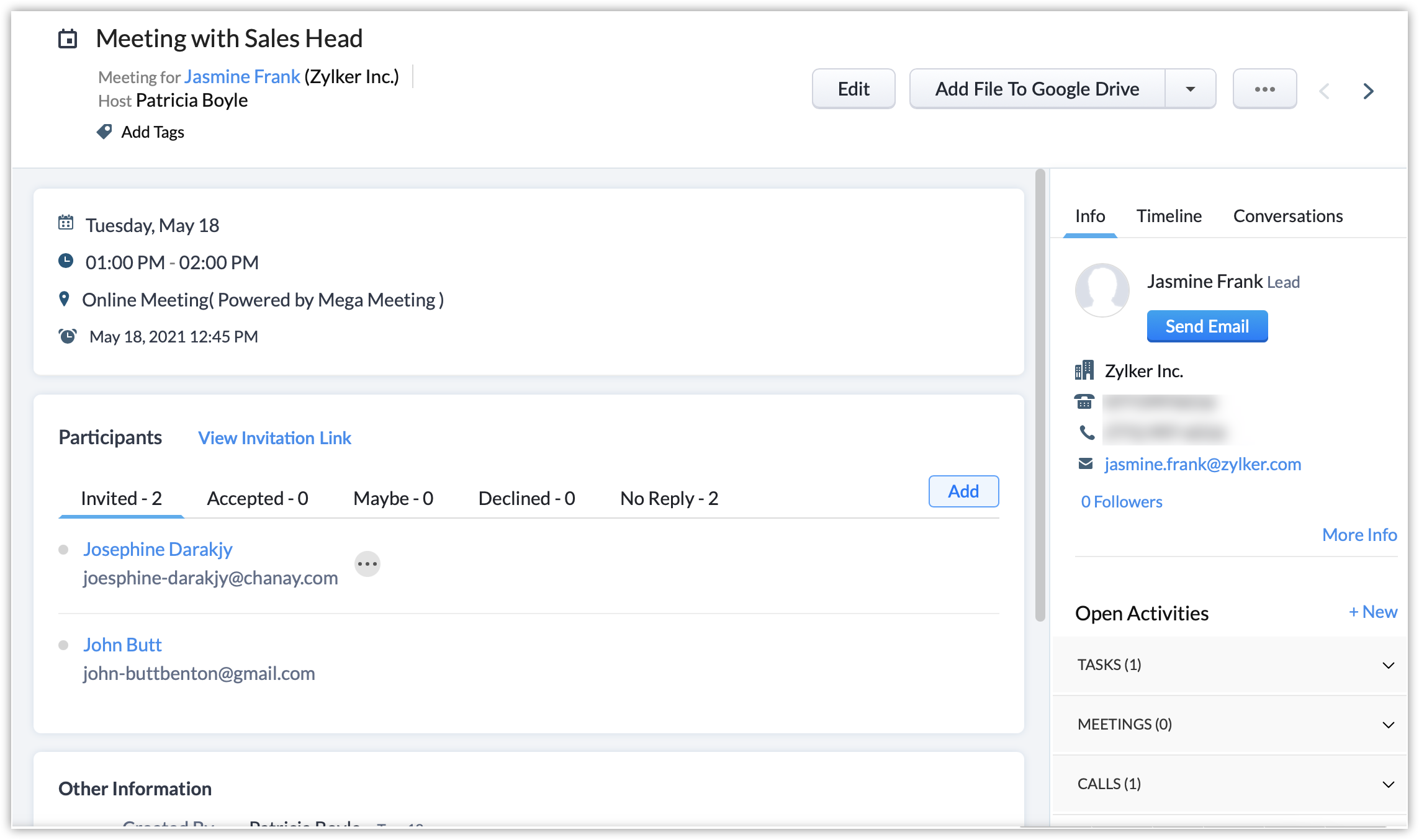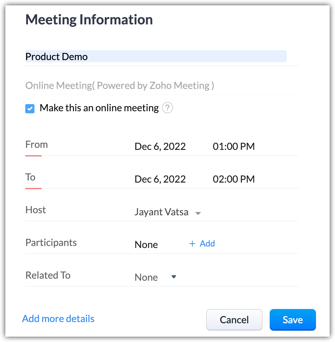 Click Save . After creating a meeting, you can invite users, leads, or contacts by clicking Add Invitees .