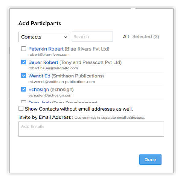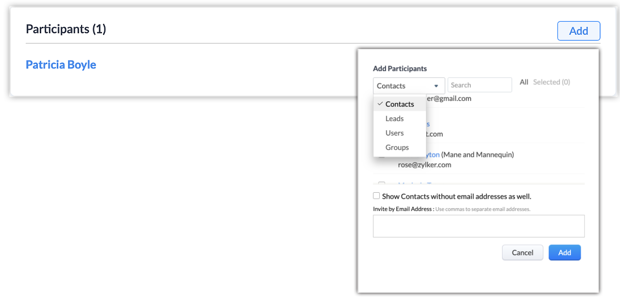 Select the check boxes of the users you want to invite. You can select users from the Leads, Contacts, Users, and Groups dropdowns to invite to the meeting.