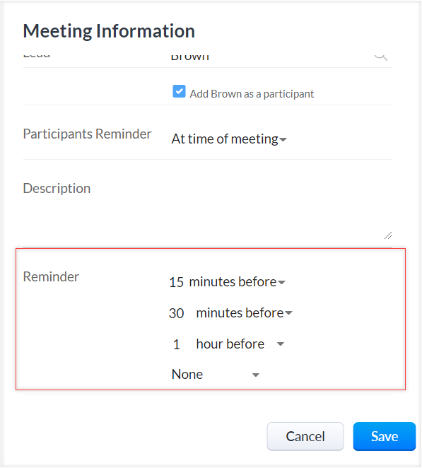 If a pop-up reminder is set for the meeting, both the meeting owner and the participants who are users in your CRM account will get pop-up reminders.
