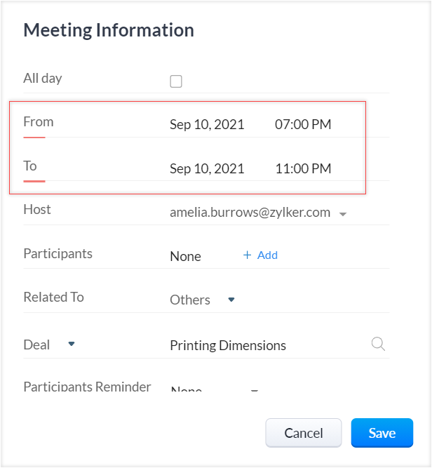When you create a meeting, the maximum duration you can set in the the From and To dropdown is 3 hours. This is because most meetings usually last 3 hours or less. While creating an event, you can set the duration for up to only 3 hours using the From and To drop-down list. This is because most events are usually conducted for 3 hours or less. However, you can manually set the duration to more than 3 hours. Double click the To field and enter the required finish time.