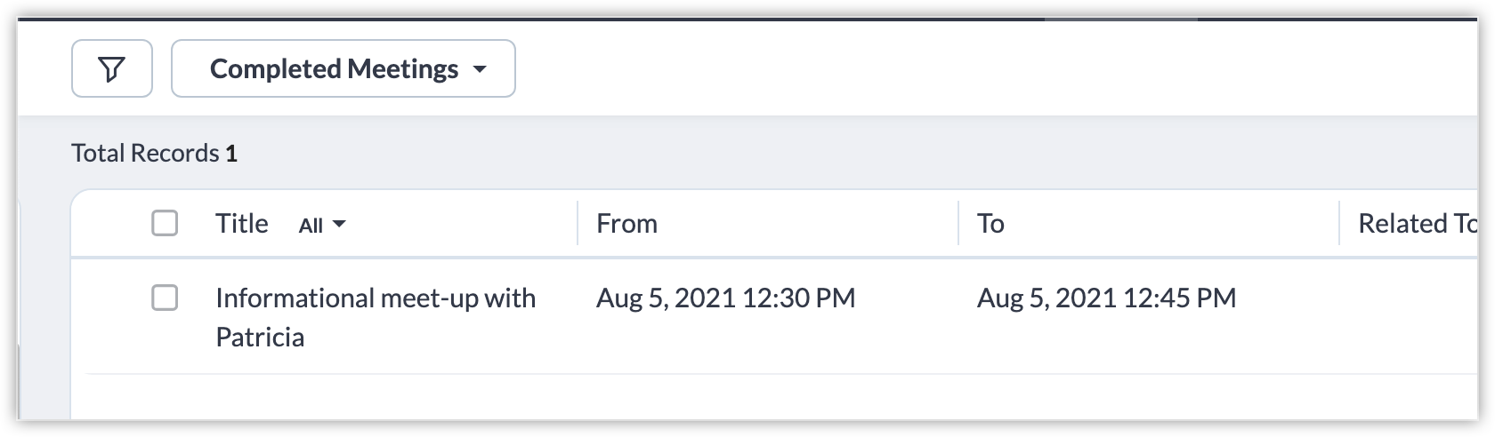 No, you do not have to manually complete meetings in Zoho CRM. Meetings will be automatically completed once the End Time has passed. You can view all the completed meetings in the Completed Meetings view. For example, if the End Date/Time is 08/05/2021, 12.45 PM, then the meeting will be automatically marked as complete at 12.46 PM.