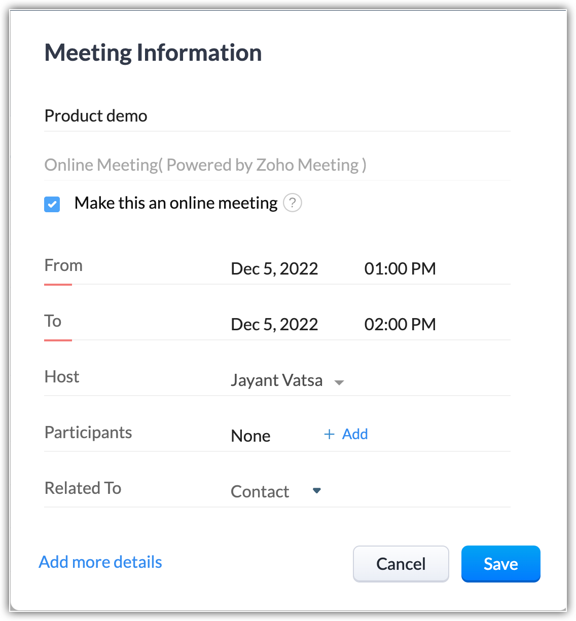 In Zoho CRM, you can create and associate business tasks, meetings, and log calls in the corresponding Tasks, Meetings and Calls module. Each activity has key information such as the date, time, priority level, and notification parameters that can be accessed from the record it is associated. This feature is available in the free edition and paid editions.