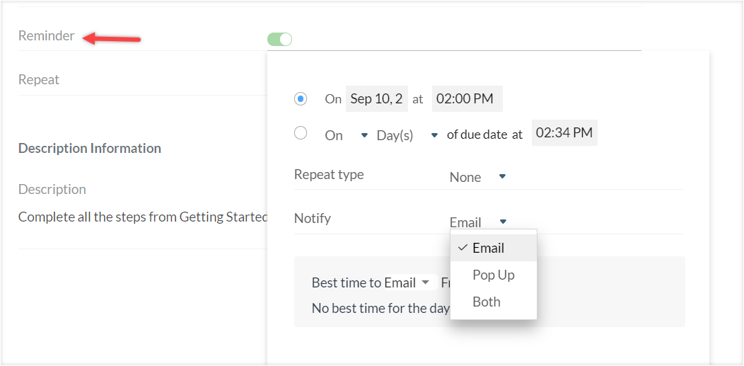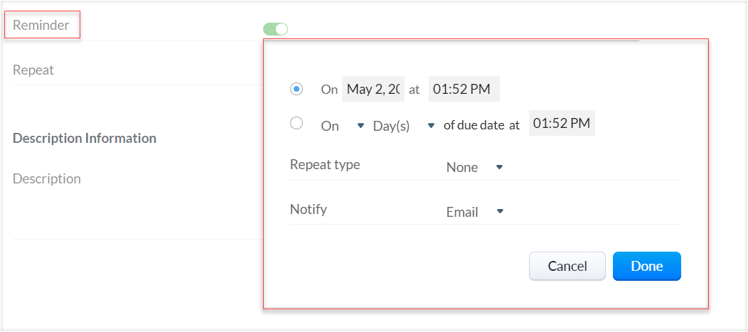While creating a task or meeting in Zoho CRM, you can set two types of reminders: