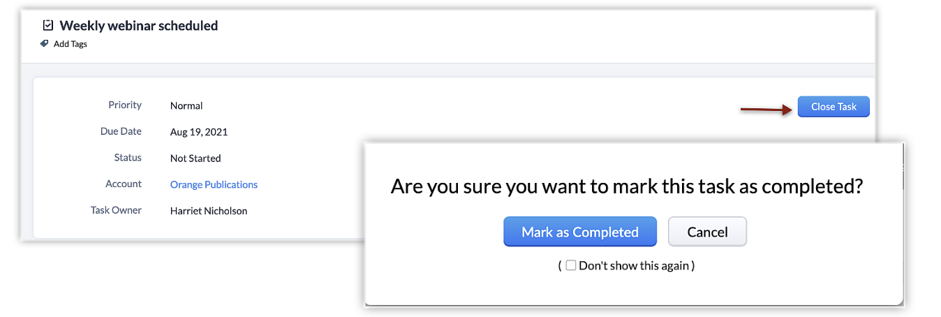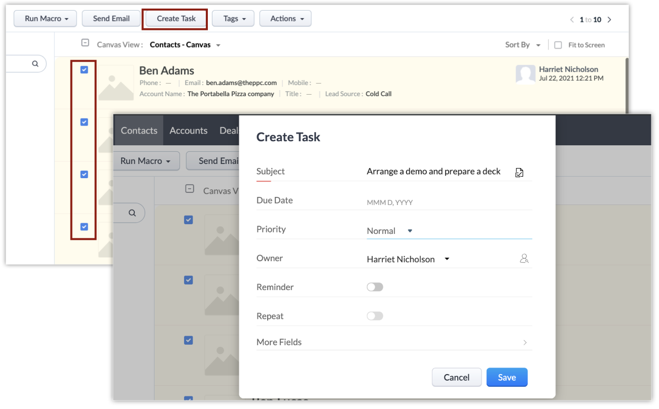 You can create tasks for multiple contacts at once. This will add identical tasks to all the selected records. For example, instead of creating tasks individually for each contact who has requested a product demo, you can simply select all the contacts and add the same task to all of them. These tasks will appear on each record and as a reminder or a to-do item to finish preparing the deck and schedule a demo.