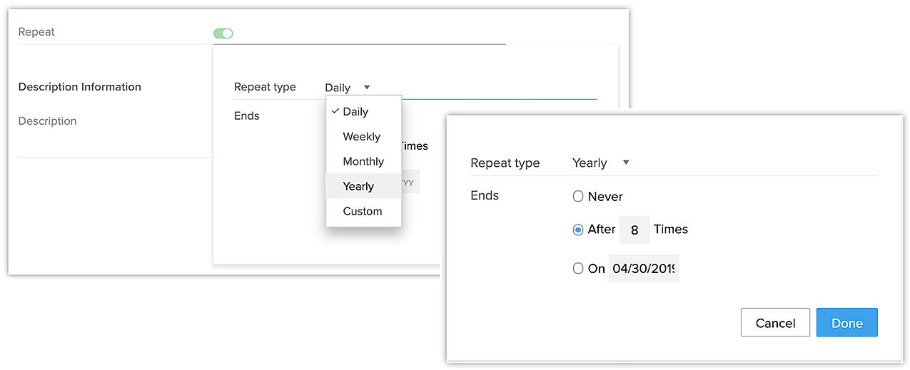 Recurring tasks repeat at set intervals for a specific period of time or indefinitely. The recurrence time can be set as daily, weekly, monthly, yearly, or a custom repeat type, which allows you to specify the time period.