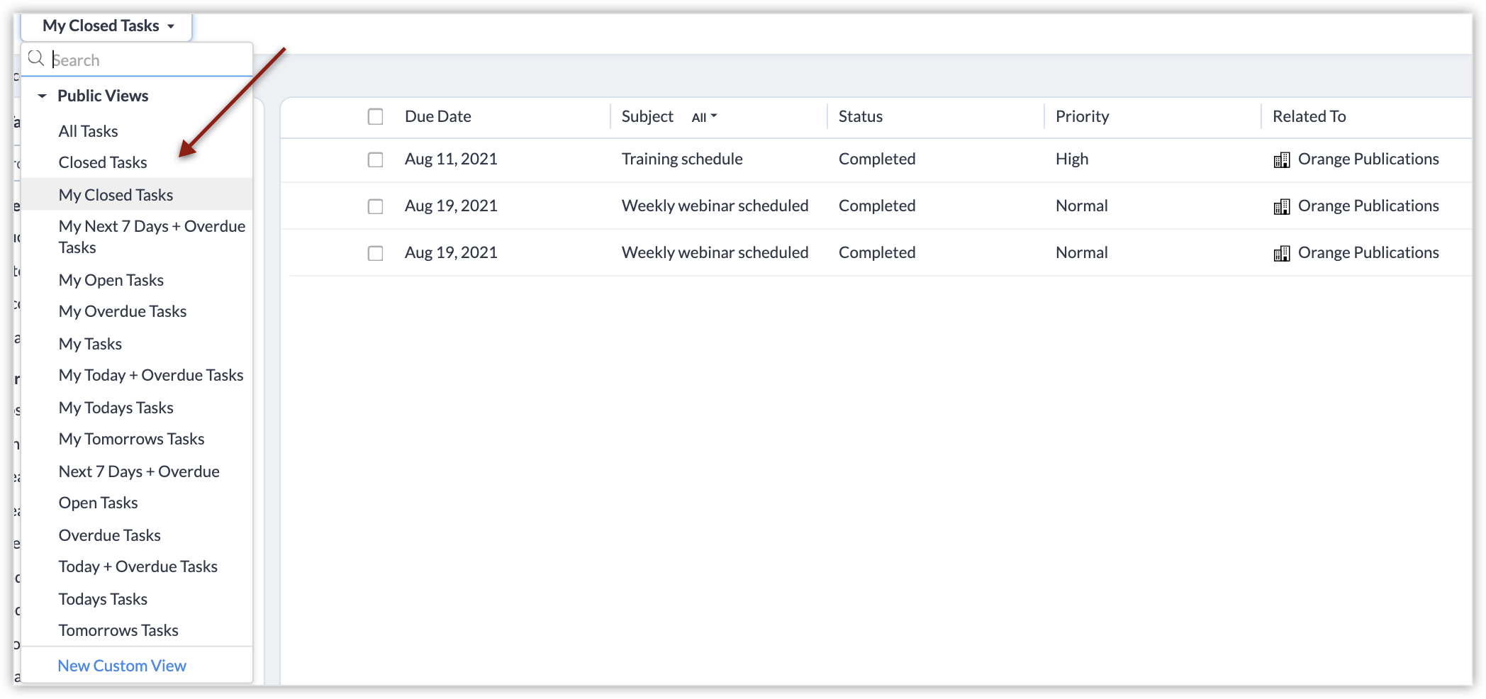 You can view the list of completed tasks in the Closed Tasks list view from the list views dropdown.
