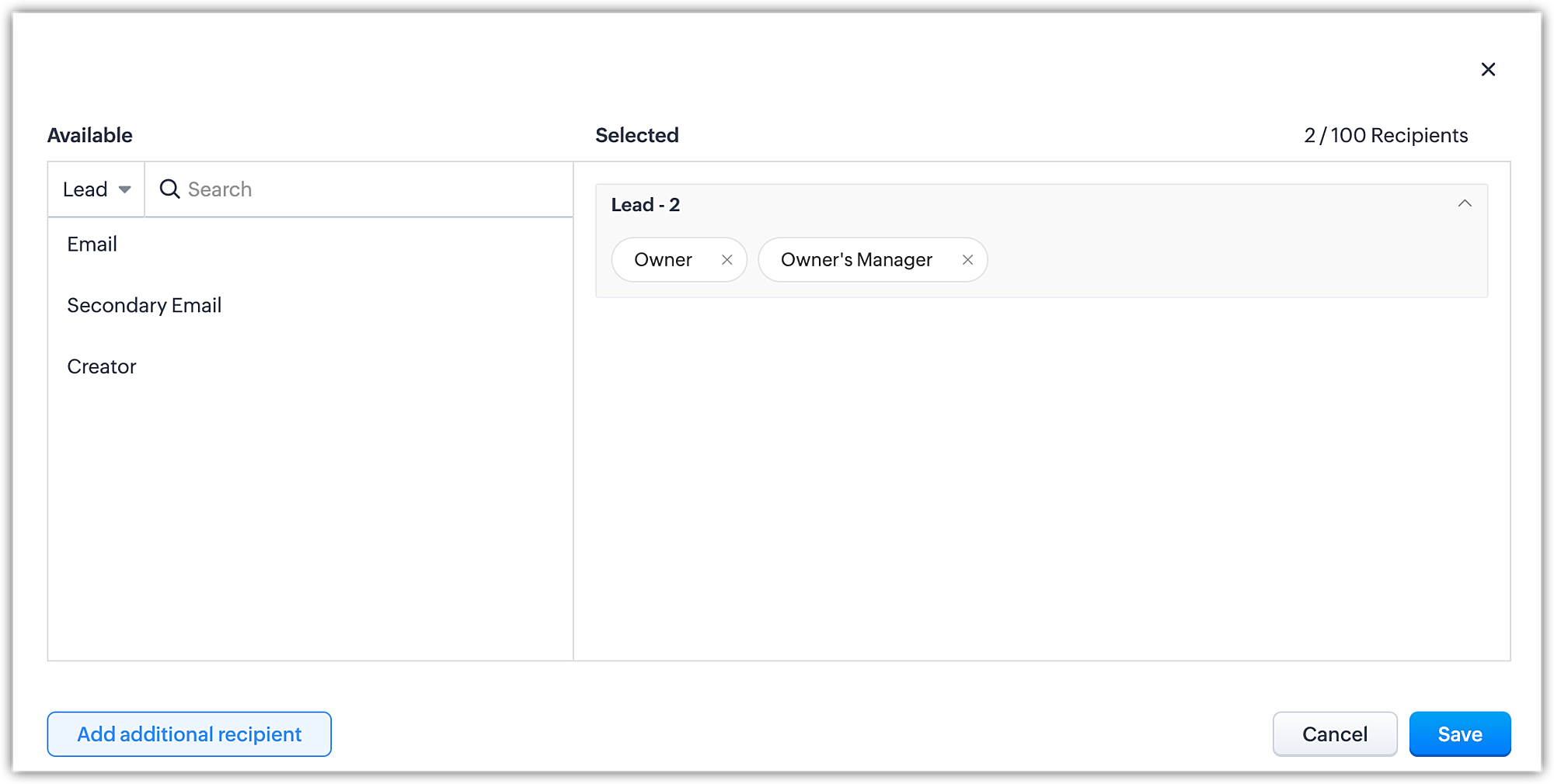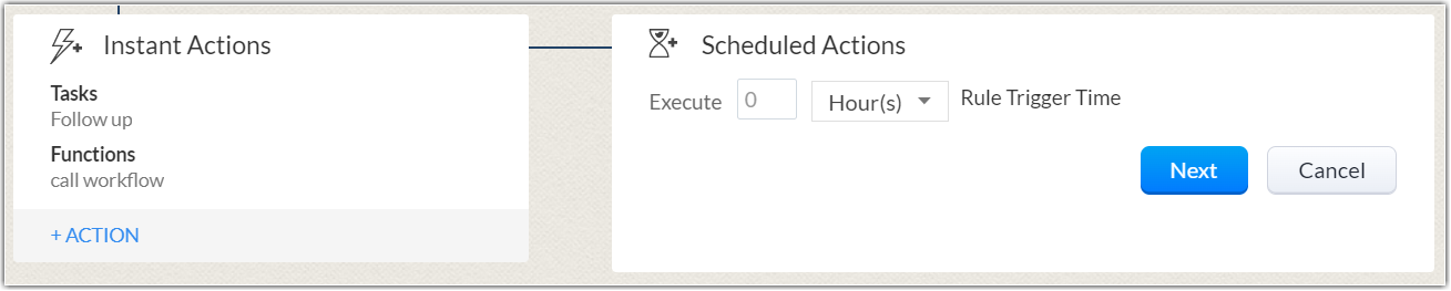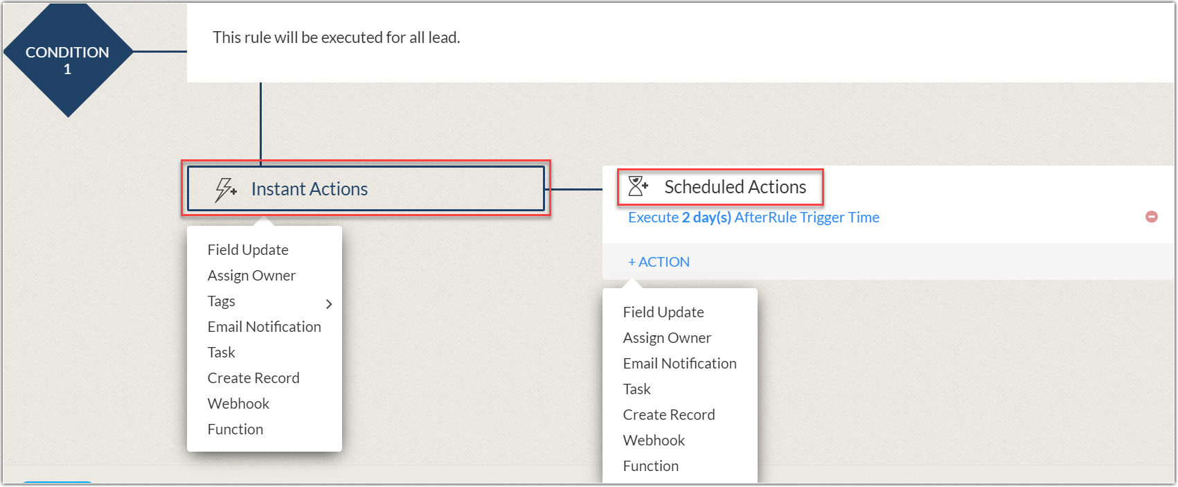 Instant action - You can add email notifications, tasks, field updates, webhooks, custom functions, create record, and send notifications via Cliq, Slack, Cisco or WebEx, which will be triggered immediately when the rule is executed. On Edit or Field Update actions, you can also convert Leads, Quotes, or Sales Orders.