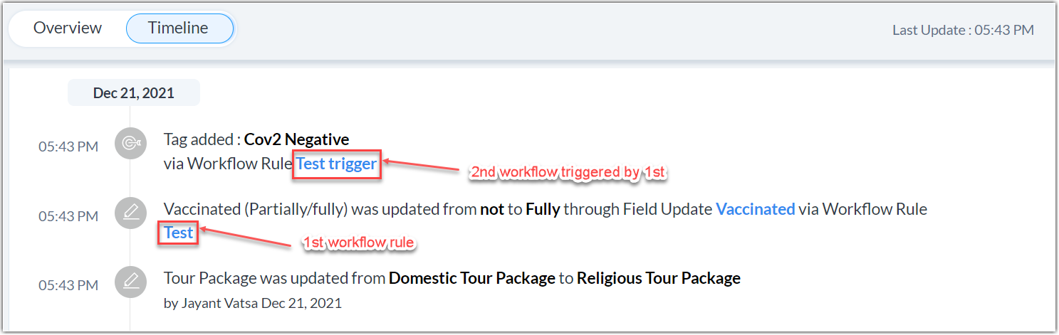 For example, a travel company has various tour packages, such as religious, international, adventure, and educational for its customers. They create a workflow rule for the leads module where, if the Tour Package field is modified to a Religious Tour package the corresponding Vaccination (Covid) field should be updated to Fully (vaccinated).