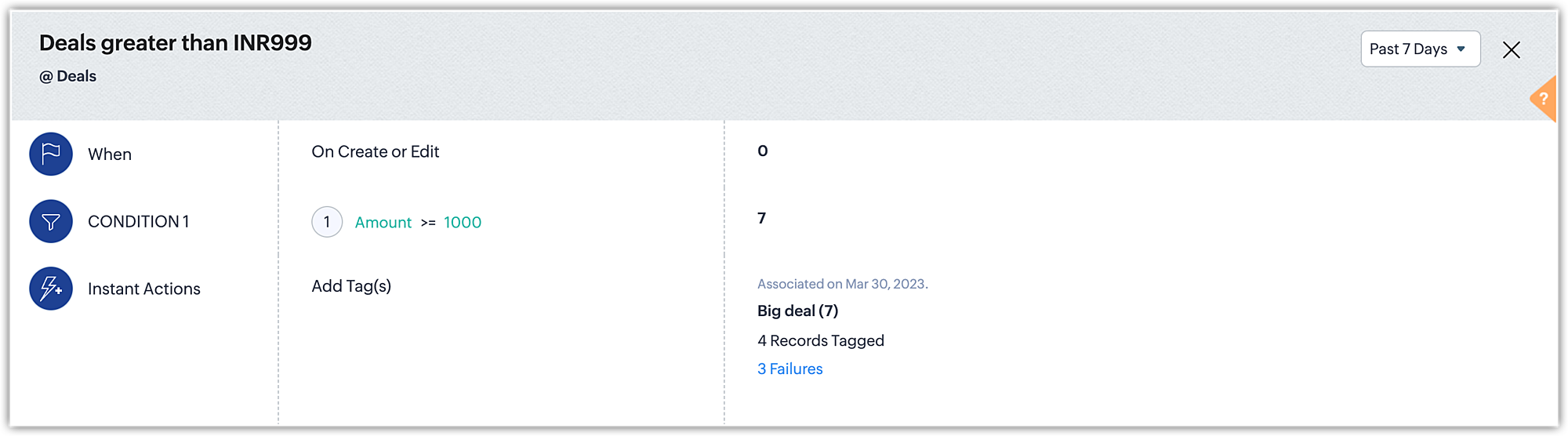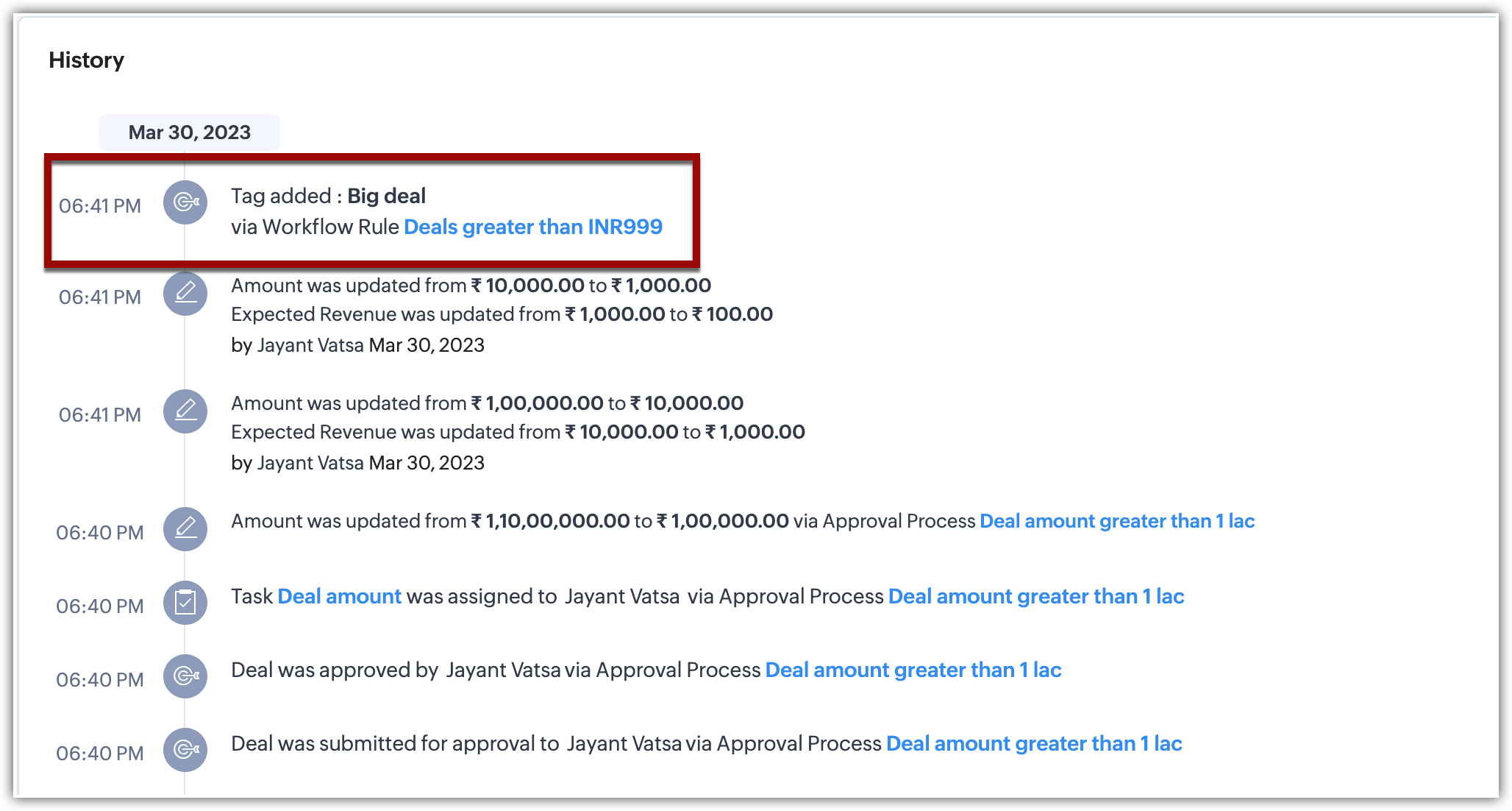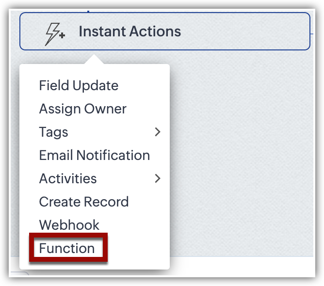 Tasks - Tasks that are assigned to the users when workflow rules are triggered. Field Updates - Automatically updating specified field values when workflow rules are triggered Webhooks - Communicates with third-party applications by sending instant web notification (one-way) every time an event occurs in Zoho CRM Functions in Workflows - Develop a set of Deluge Scripts to receive responses from other applications and update CRM modules when the workflow criteria is fulfilled Assigned Owner - The assign owner action lets you automatically ascribe ownership to a record when the associated workflow rule is triggered. This action applies to all the triggers except delete of a record or cancel of a meeting. Tags - Unique identifiers that can be associated with the CRM records to search, sort, categorize, filter, and segment them more efficiently Create record - Automate record creation in CRM by associating a module with it (lead, contacts, accounts, deal, etc.)