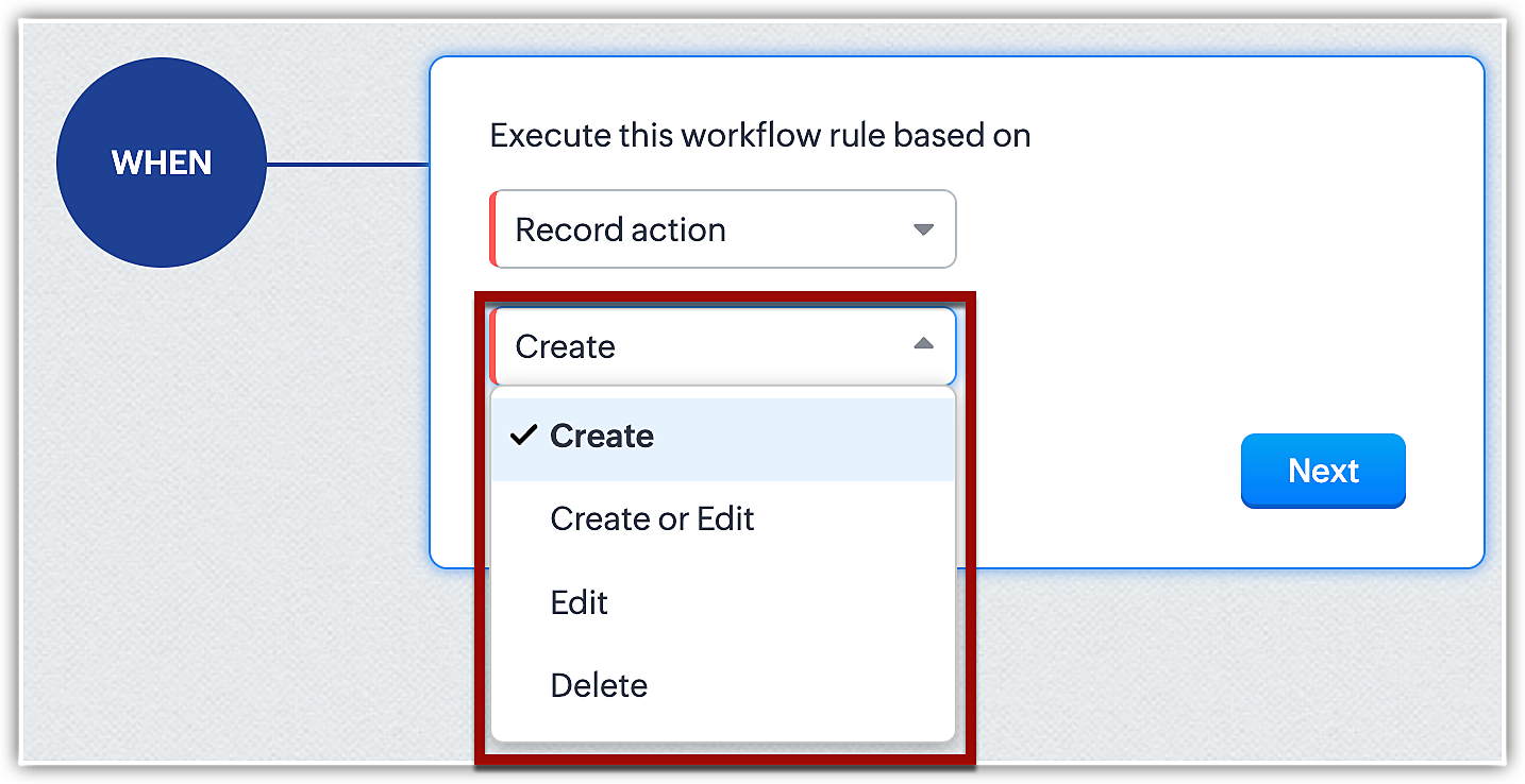 Create or Edit : This option will trigger a rule whenever a new record is created or whenever the existing record is updated/edited.