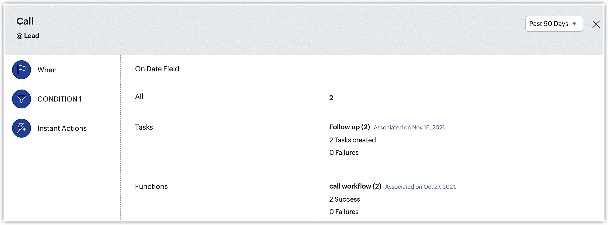 You can also view the workflow usage report for a particular workflow rule, to get an overall idea about the usage details of your created workflows.