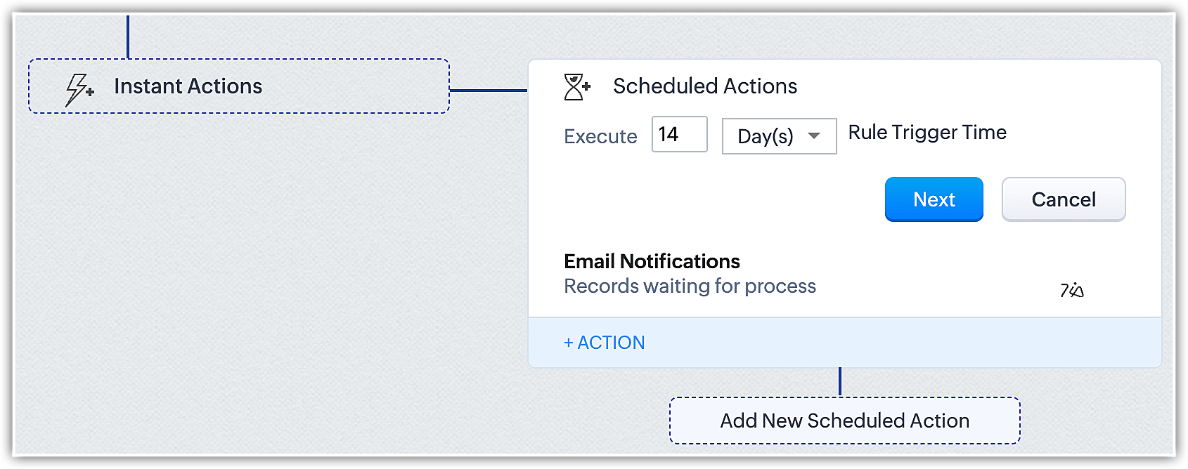 Scheduled action - You can add email notifications, tasks, field updates, webhooks, custom functions, and send notifications via Cliq, Slack, or Cisco, which will be scheduled and triggered based on a specified time.