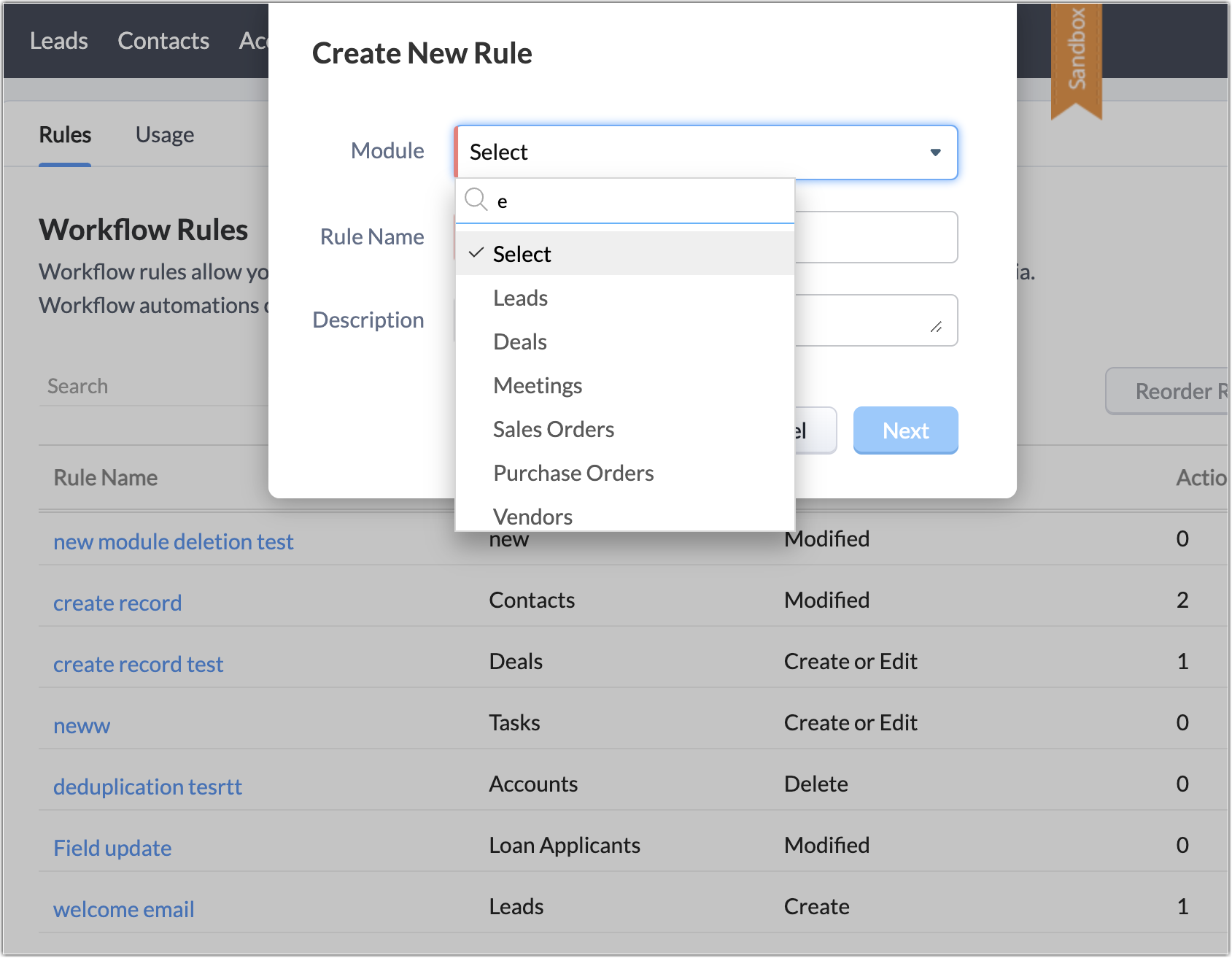 The workflow rules can be created for the given modules such as, leads, contacts, accounts, deals, tasks, meetings, calls, quotes, sales orders, purchase orders, invoices, campaigns, vendors, price books, cases, solutions, visits, emails and custom modules.