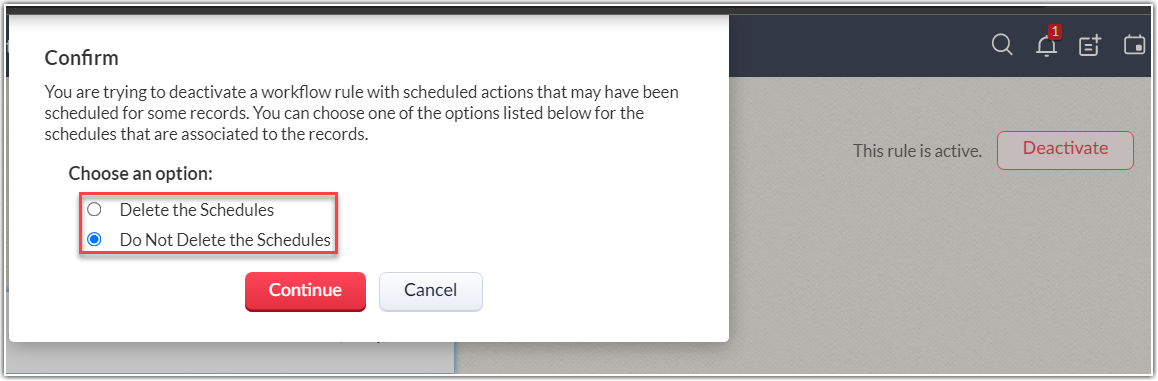 If you deactivate an existing workflow rule, all the associated actions will be inactive at once for the instant actions. However, for scheduled actions you will get options to select between Delete the Schedules and Do Not Delete the Schedules.