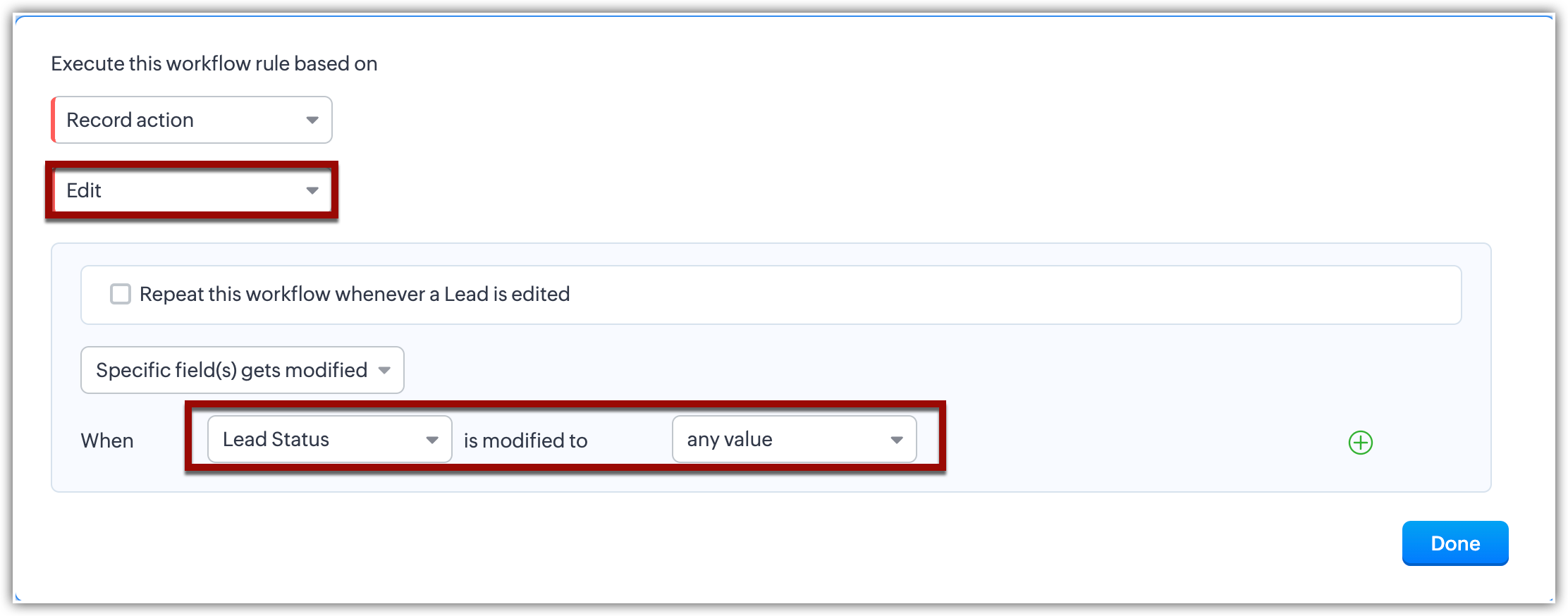 For 'Edit', 'Create or Edit' actions, an option to recur the workflow is provided. You can check Repeat this workflow every time a record is edited , if you want the rule to recur.