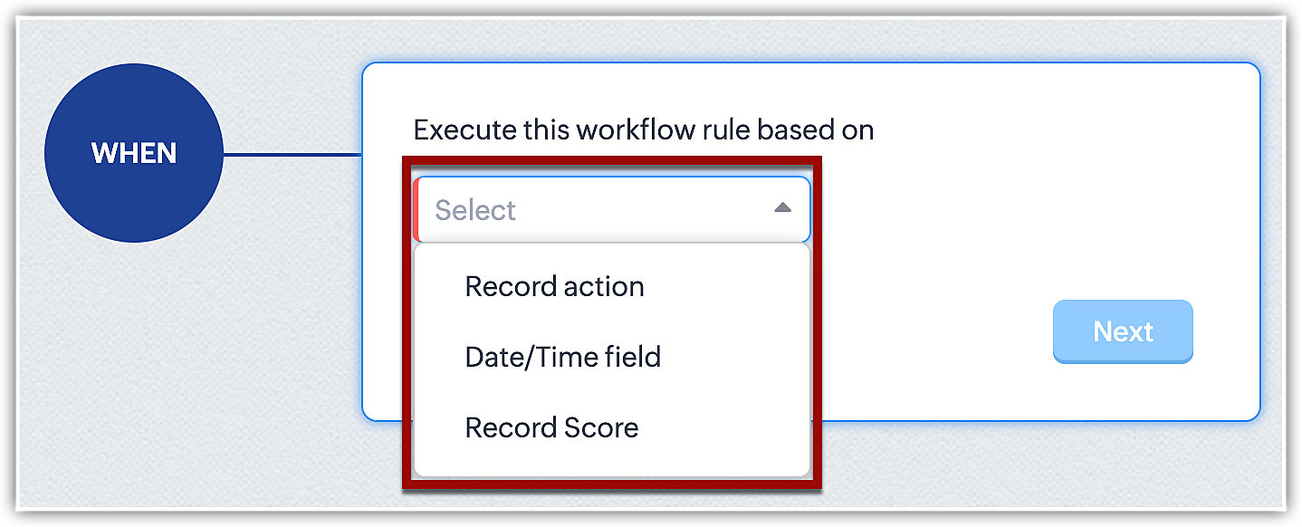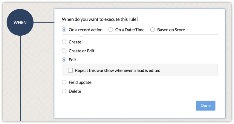 In Zoho CRM, you can automate some of the routine processes by triggering a workflow using Rule Trigger.