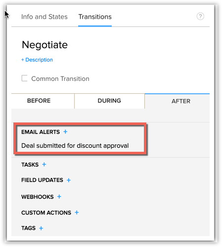 Common Transitions are those that can be reused at any point in the process to get to a certain stage. For instance, in a deal followup process, typically closure of a deal (whether won/lost) happens at the end of the process, after crossing 6-7 steps. But in reality, a customer may express disinterest at any point in the process, not necessarily at the contract stage. So you can have what we call a Common Transition called "Drop Deal", so that this button will be seen at all stages in the process. You can simply perform this transition to mark the deal as lost and get out of the process.
