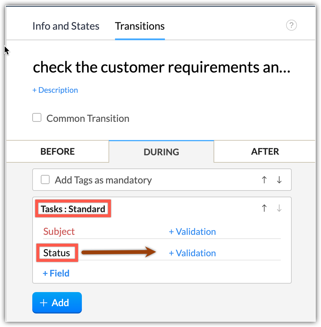 Can I mandate the status update of a task in the 'During Transition' settings?