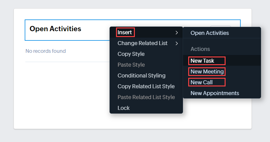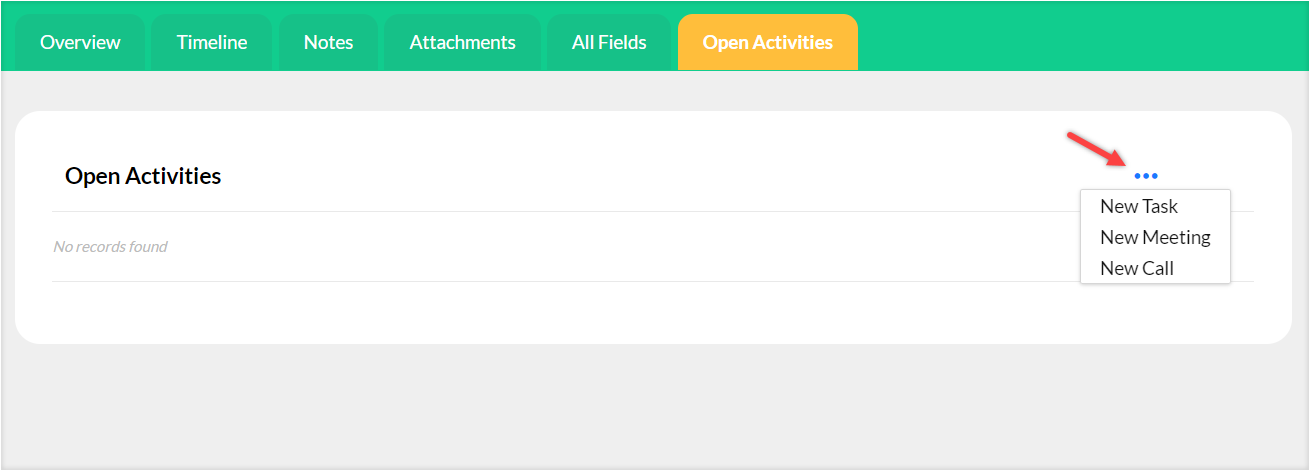 By default, the actions New Task, New Meeting, and New Call are found under the ellipsis (the three dot menu) that is available in the right corner of the Activities related list.