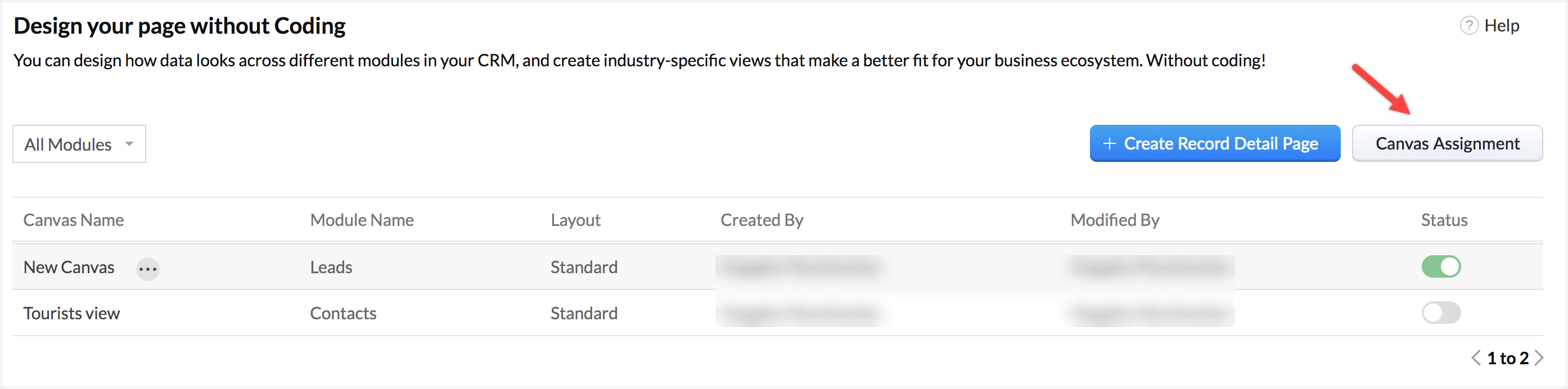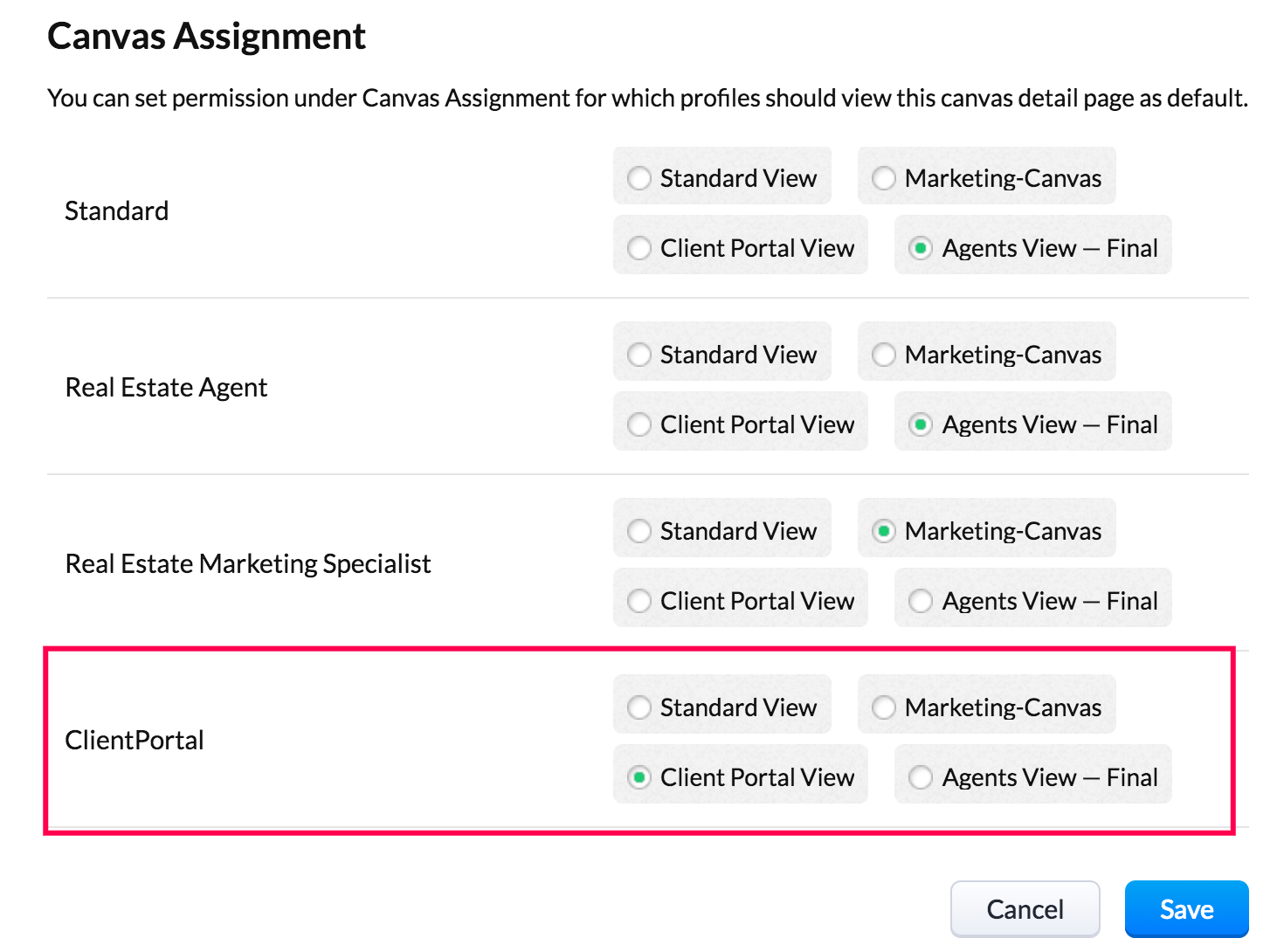 When you design a new record detail page using Canvas, you will be offered an option to assign the new page to the desired profiles. For each profile you can select which view is applicable — whether the Standard (Default) View or the new user created canvas view.