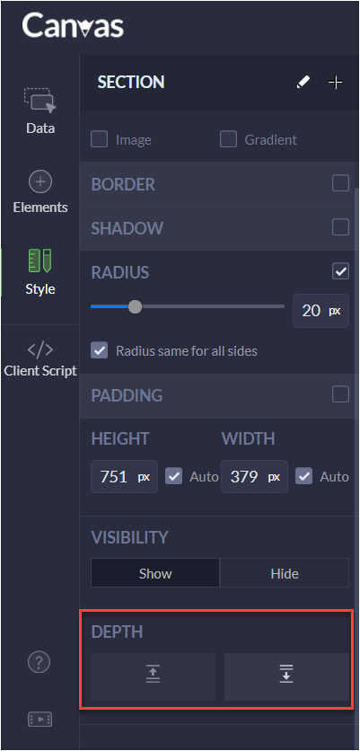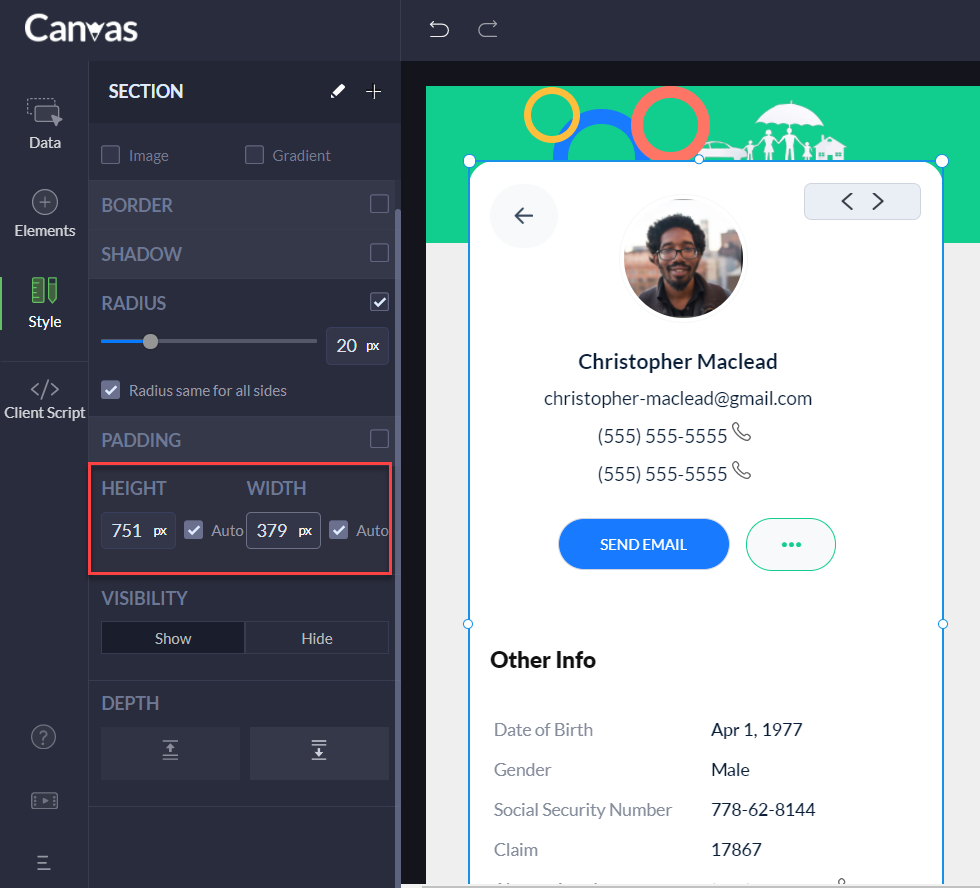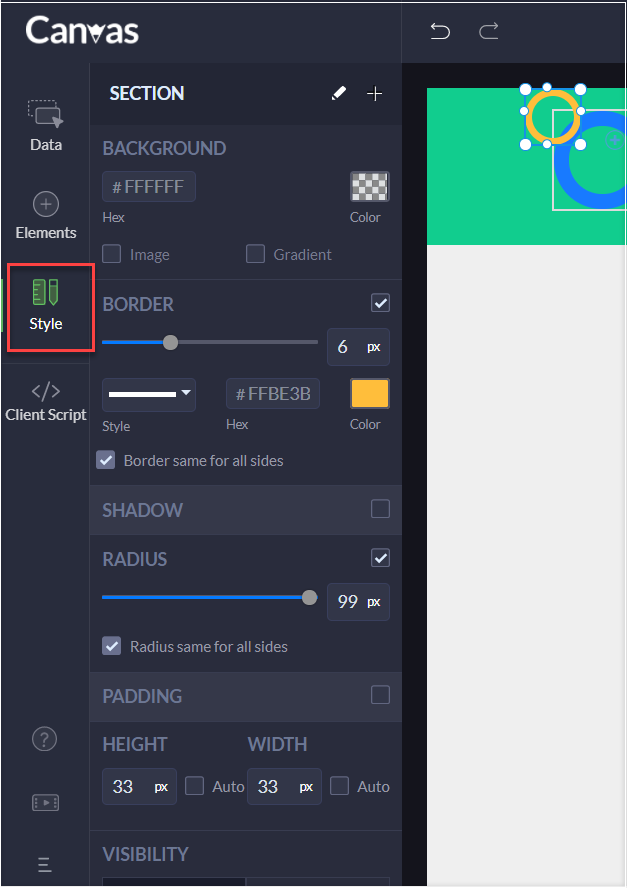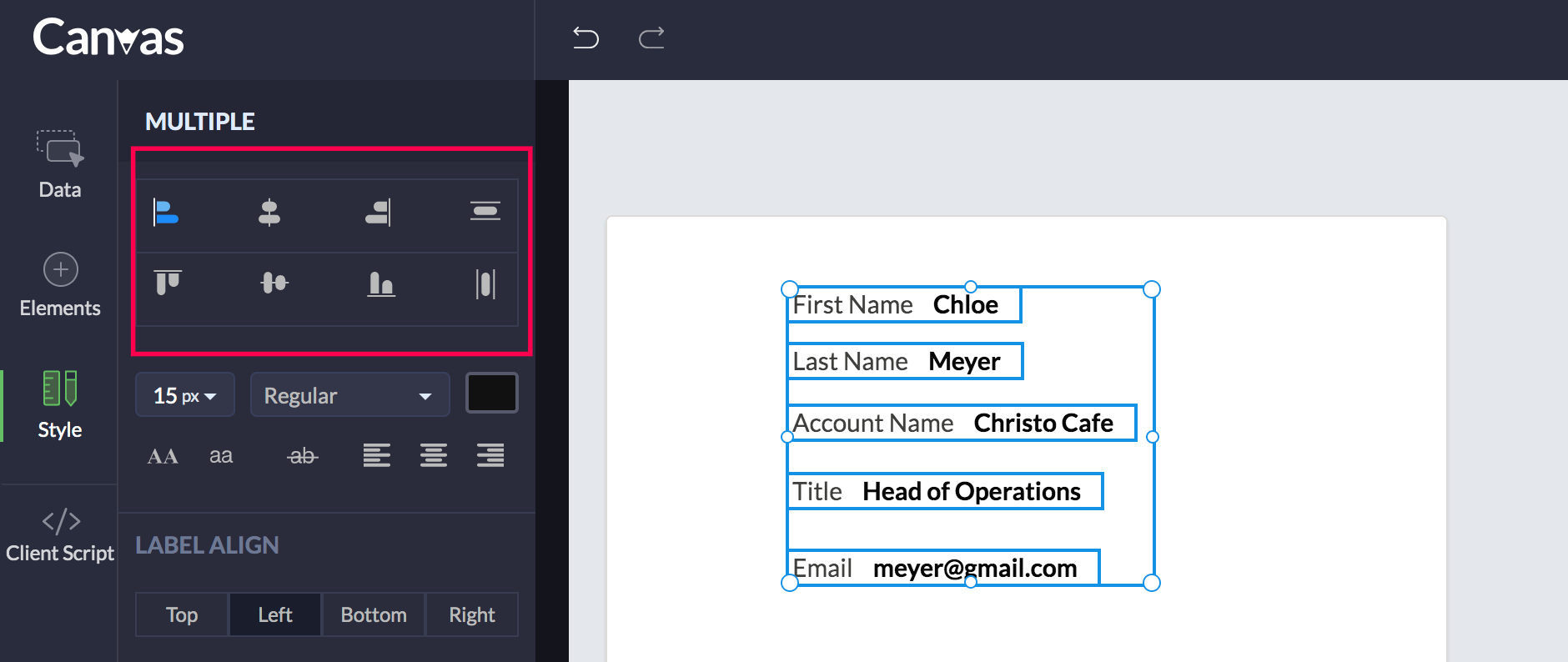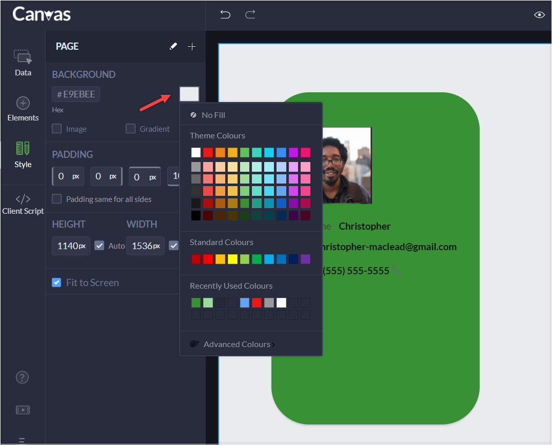 Styling options can be changed for each of the data component on the left panel of the Canvas builder.