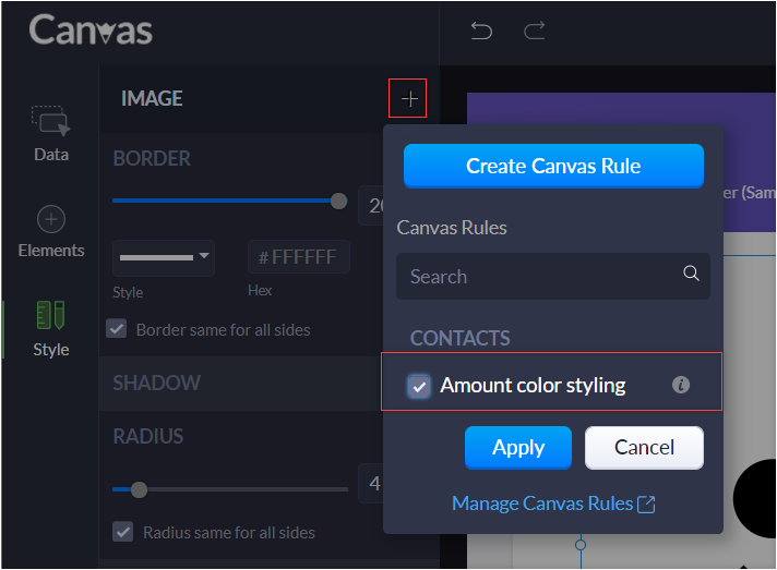 - In the Canvas Rule pop-up that opens, choose the required rule from the list and click Apply. This way the chosen canvas rule gets applied to that element.