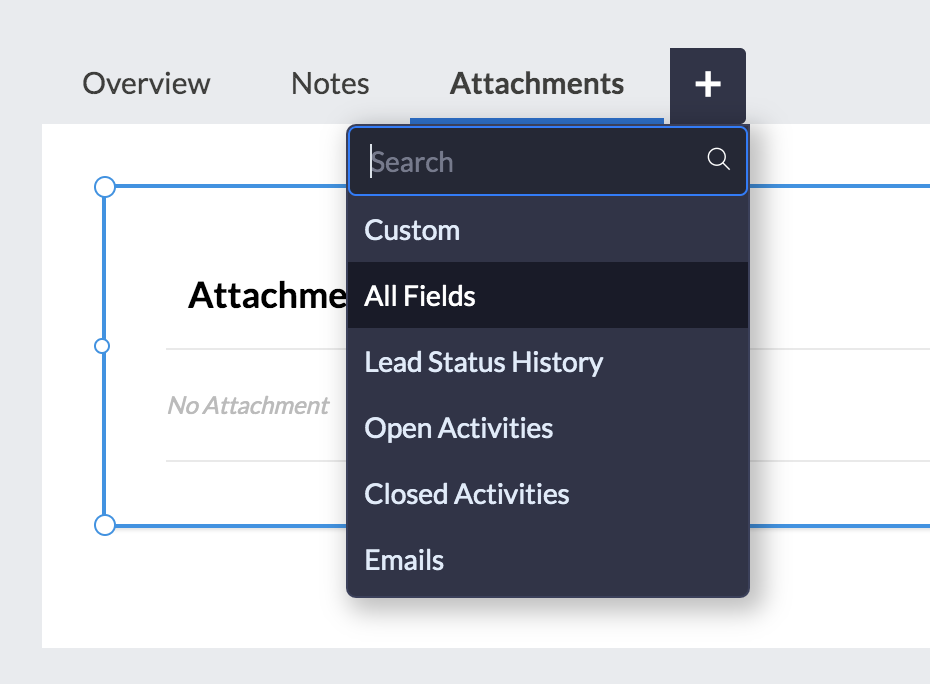 As an alternative, you can add the All Fields option from the Tab element, which contains all the fields in the module. Even if you have missed out on adding any field elsewhere in the Canvas, a user can still navigate to the All Fields tab and access the data they need.