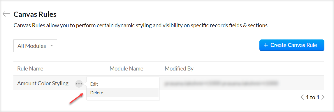 - In the list of canvas rules that gets listed, click Delete from the ellipsis icon.