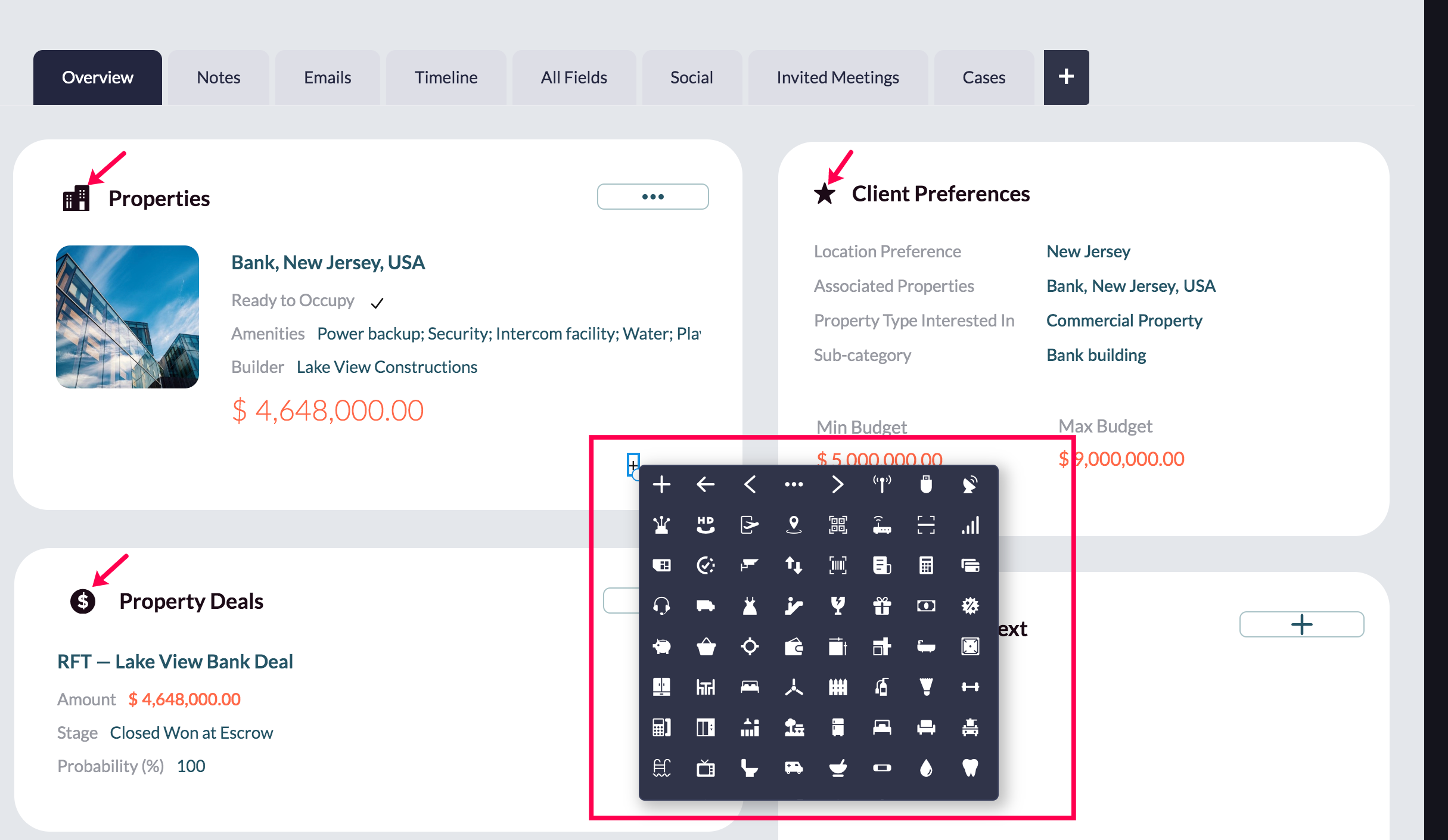 Icon in Zoho CRM Canvas, are simple visual illustrations that can be used to complement your data. As they say, a picture is worth a thousand words. Using an icon against different sections of data, or a single field will convey the essence of the information about a record easily, at a quick glance. Here are some examples inserted in appropriate sections as shown in the image below: Properties (building icon), Deals (Dollar icon) and