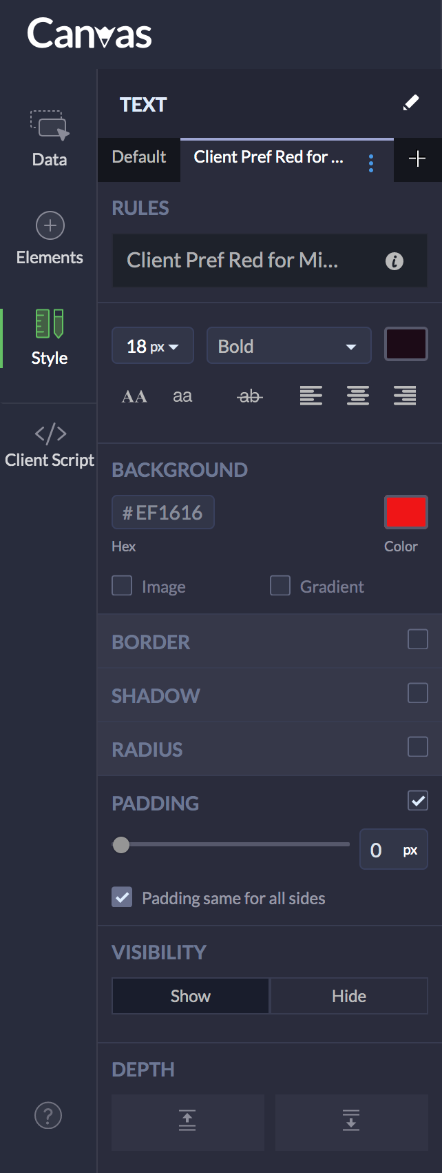 For instance, you can create a Canvas Rule for a text element, and apply any of the following settings to the text component: