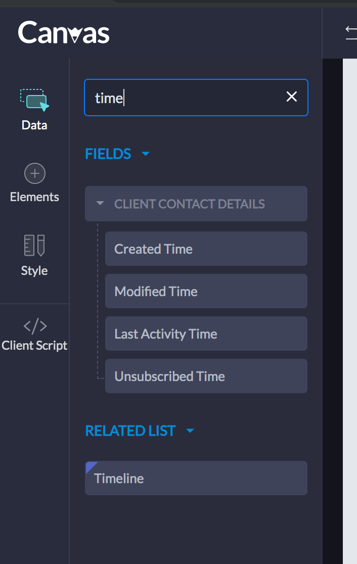 In your Canvas builder, go to the Data component. Under the Related List section, you will find Timeline. You may also use the search bar to look up the Timeline component quickly. You may either drag and drop Timeline component into the editor or insert inside a tab.