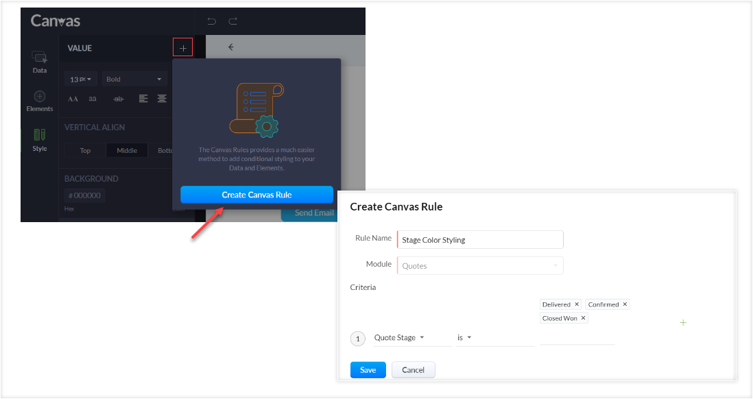 Conditional styling in Canvas is an option that lets you style the elements in Canvas based on a specific condition. For example, you can choose to design a currency field " Travel Package Cost" to appear in red if the value exceeds above 10000 to indicate the importance of the deal to the sales reps. Similarly, the field can appear in green is the value is less than 10000. Similarly, you can create multiple conditions like these and these will be listed as Canvas Rule.