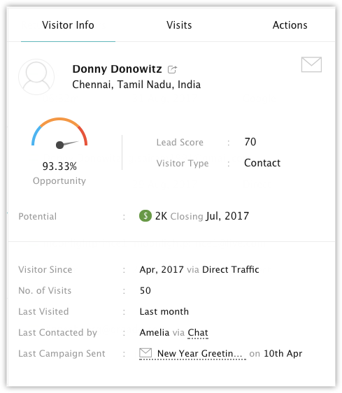 Based on their tracking information and CRM data, you can immediately chat with them and close deals, all from within Zoho CRM. The integration between Zoho CRM and Zoho SalesIQ opens up tremendous possibilities that help improve sales manifold.