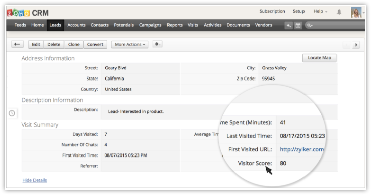 Zoho SalesIQ gives you detailed visitor tracking information. When this tool is combined with Zoho CRM, you get a powerful integration which keeps you better informed about your customers' interests. You learn key details such as when they visit your site, the amount of time they spend on it, the pages they frequent and so on. Combining these visitor-tracking details with CRM data enables you to offer your customers the deals that they would most definitely be interested in.
