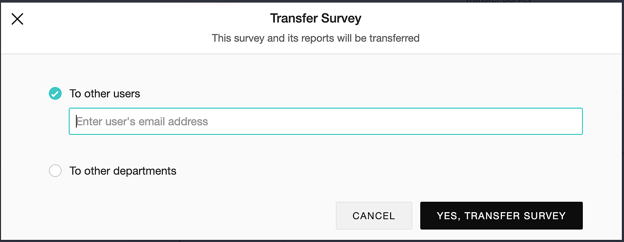 Select To other users to transfer your survey to individual users. Enter the user's email address in the text box.