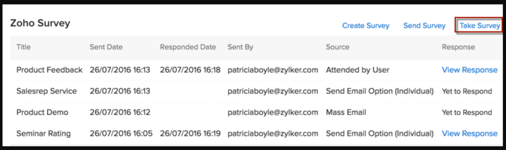 In the lead or contact's Details page, scroll down to the Zoho Survey Related List.