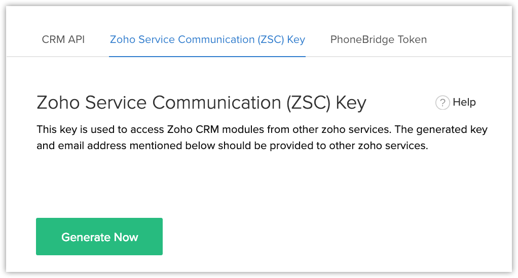 The ZSC Key refers to Zoho Service Communication Key.The ZSC Key allows you to fetch data stored in Zoho CRM from other Zoho services.To generate the ZSC key,