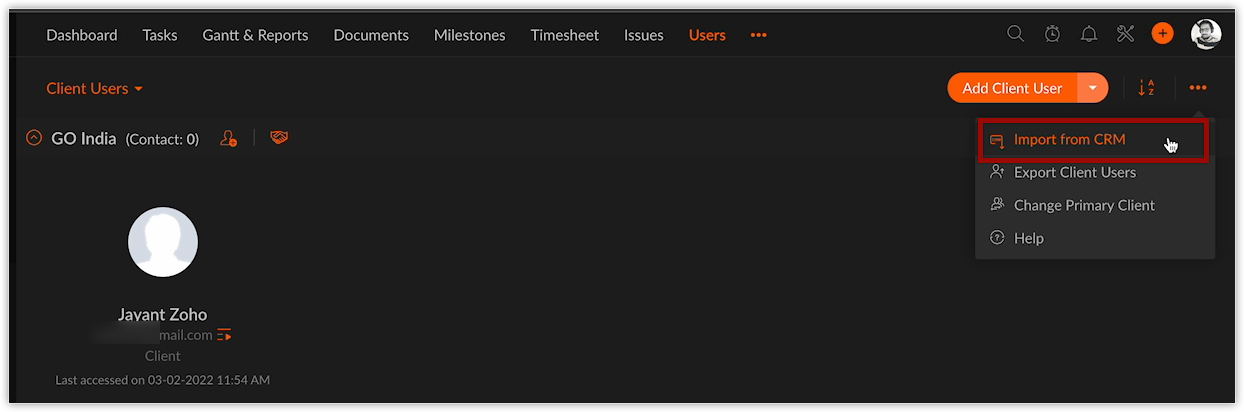 Yes, you can import users from Zoho CRM to Projects. To import users from CRM, follow these steps: