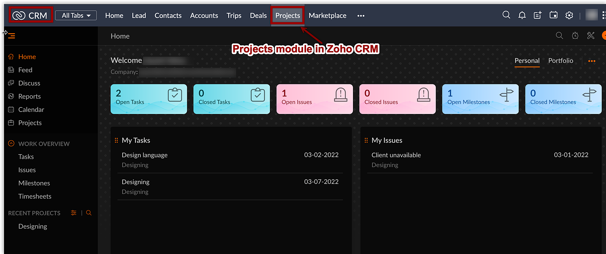 Upon successful integration, you'll see a dedicated Projects module in Zoho CRM, making it is easy to operate within the platform and eliminating any need to switch between tabs to track the progress of your project(s). Since projects are directly associated with clients, the sales data and project information is available seamlessly at a single location.