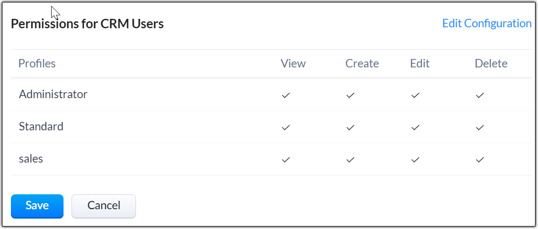 - In the Zoho Projects Integration page, under the Permissions for Zoho CRM Users section, click Edit Configuration.