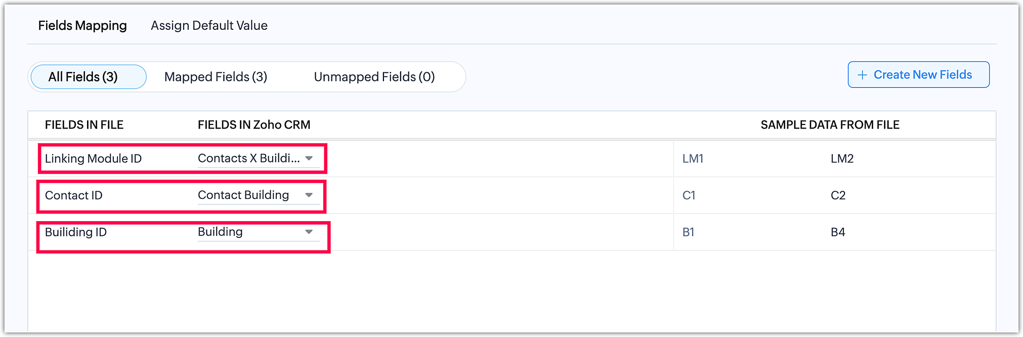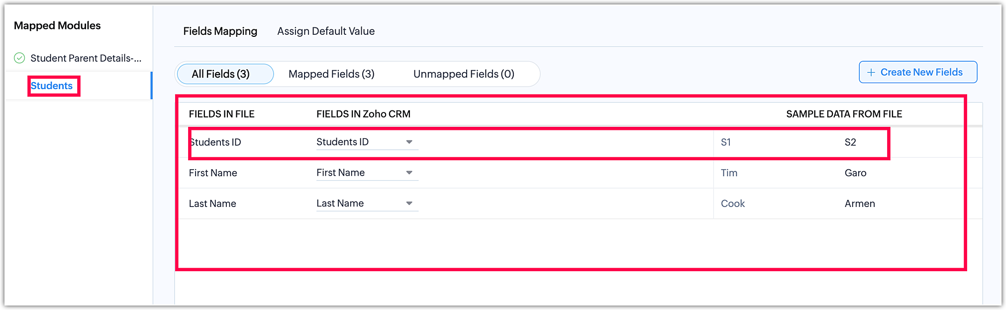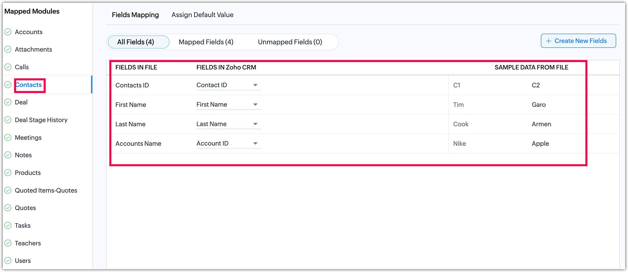 As shown above, you can perform the field mapping of the different module files.