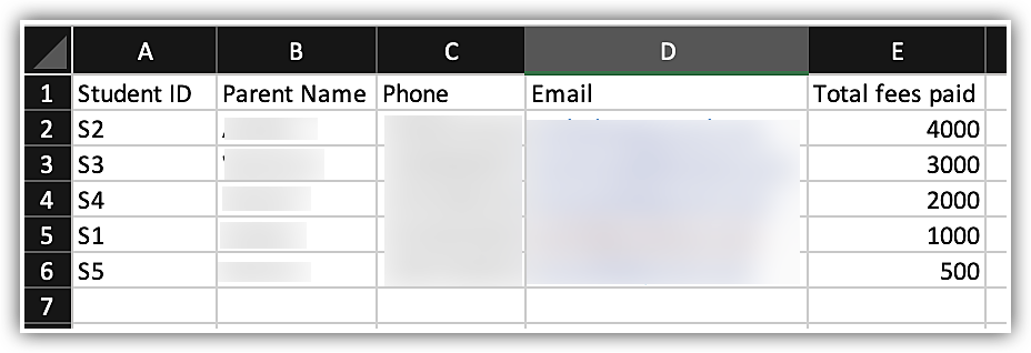 To associate the sub-form data with the parent data, the sub-form file must contain the Parent Data ID (Student ID), as demonstrated above.