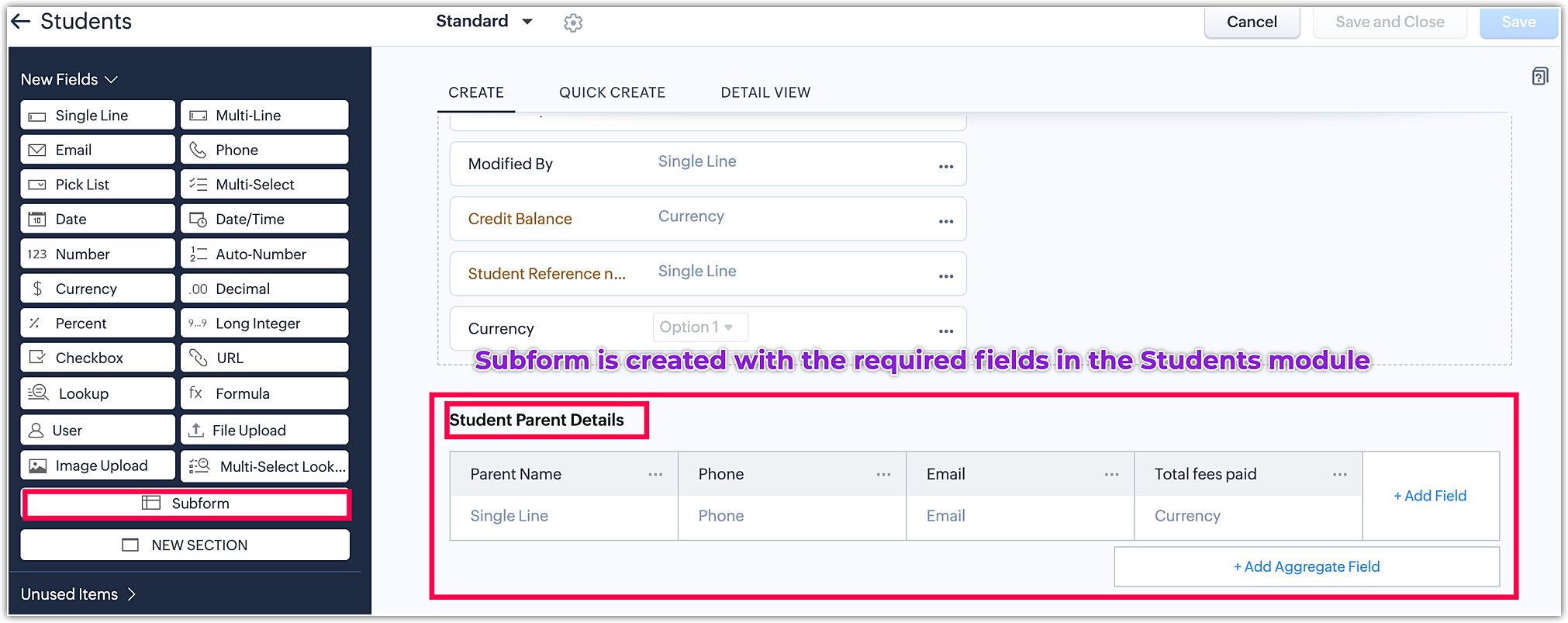 Note: All kinds of field types can be created in the sub-form except the Multi select lookup field.