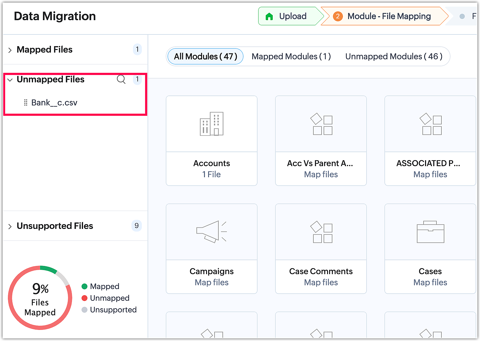 At the module mapping stage, you can access information about Mapped files, Unmapped files, and Unsupported files. These file statistics are conveniently located on the left side of the page, providing a clear overview of each category.