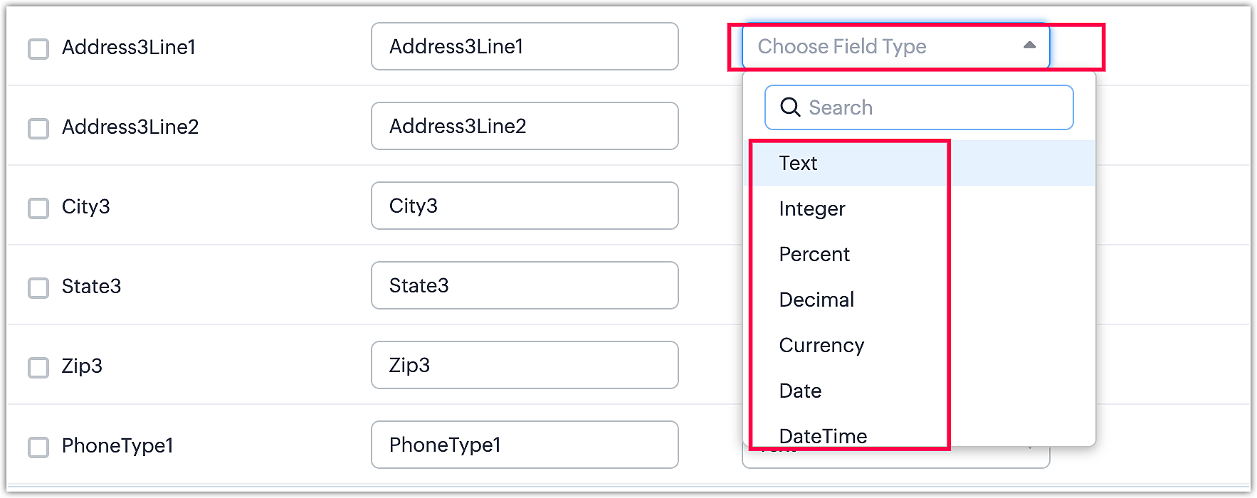 To create new fields, you need to select the field type from the dropdown. Please refer to the below image to select the field type to create a new field.