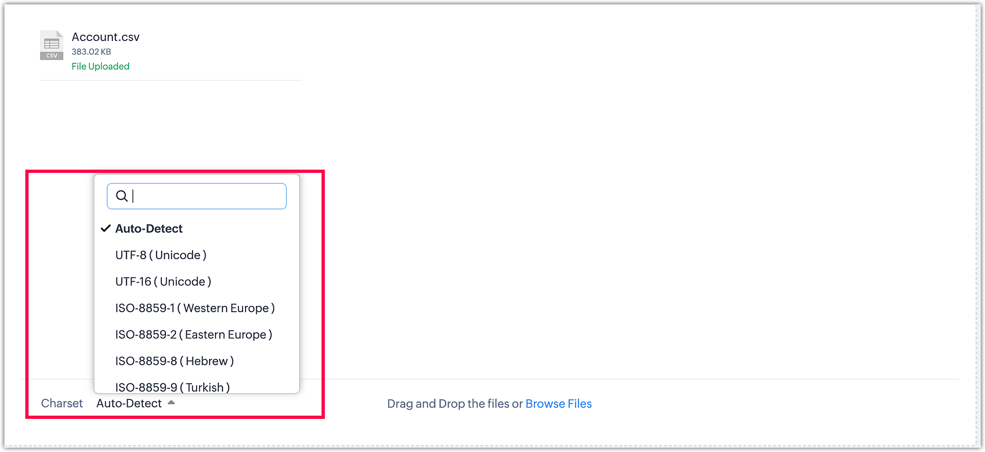 While using the Auto-Detect option, the system identifies the character set of the uploaded files and proceeds with the same character set. However, this method has limitations, particularly when dealing with files that contain a mix of English characters and special characters. For example, if a file has 20,000 records and only some of them contain special characters, the Auto-Detect might identify the characters of the initial 100 to 500 records (which may lack special characters) and continue with the same character set for the rest. As a result, the remaining records with special characters may not migrate accurately, leading to incorrect values.