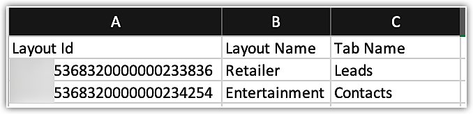 Please refer to the sample layout file, which is shown below. It should contain the Layout ID, Layout Name, and Tab Name (Module).