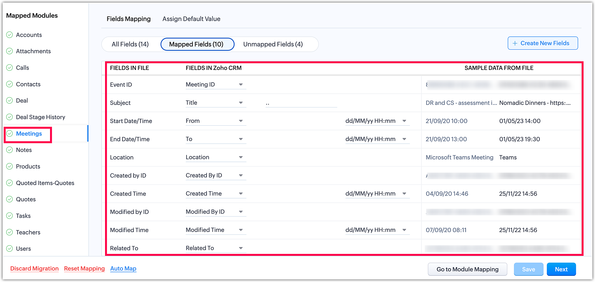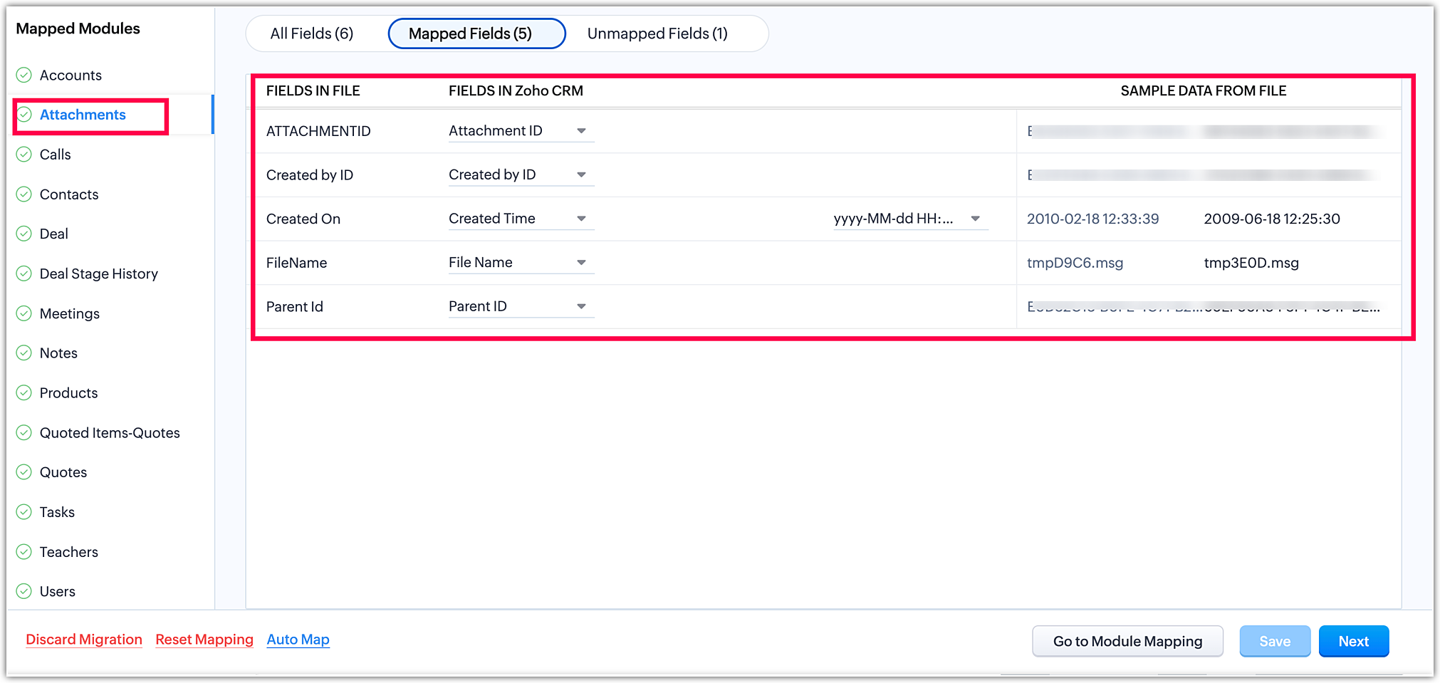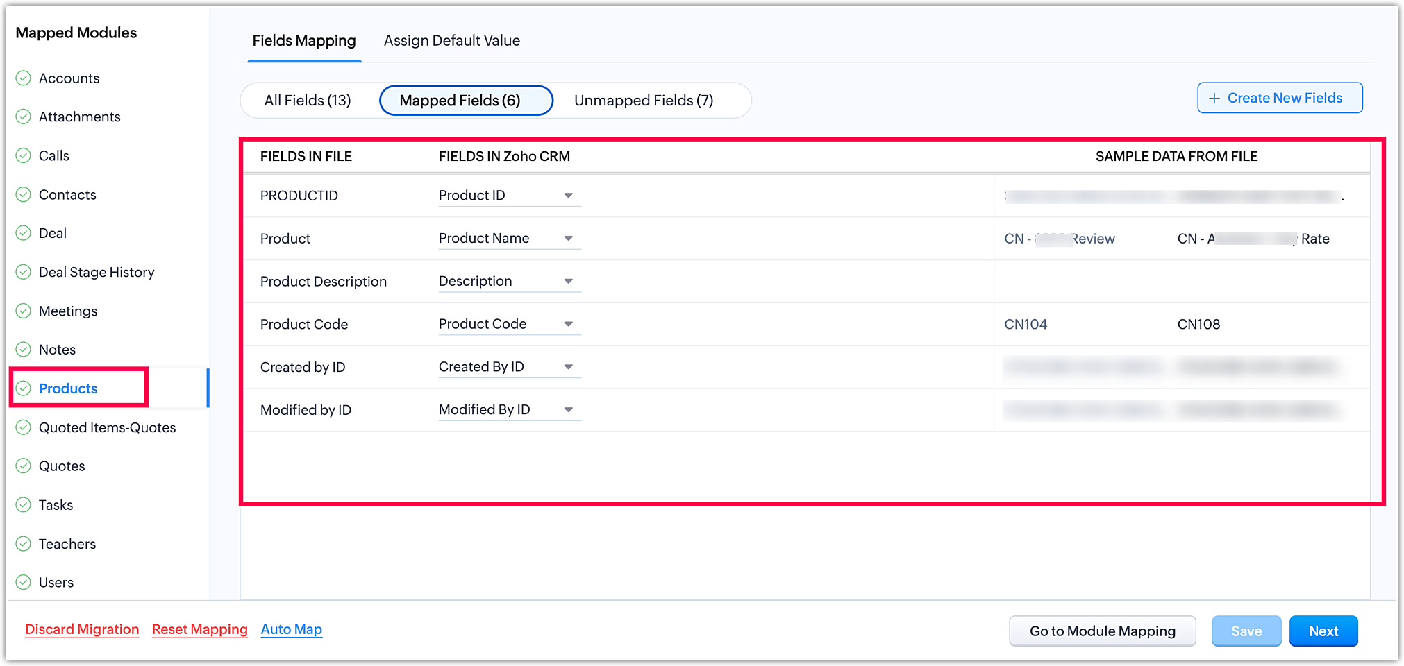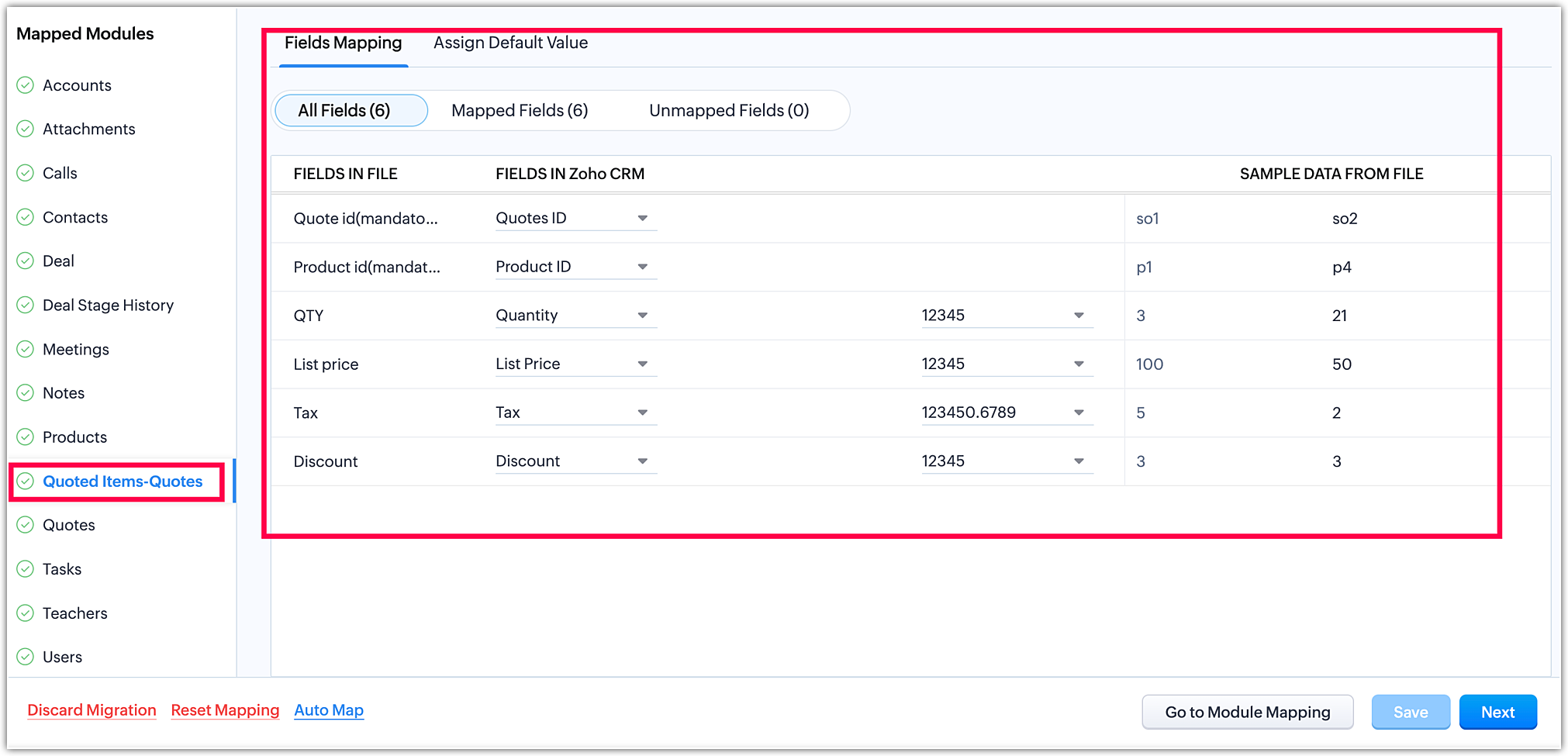 Once you have completed the module mapping, click Next in the bottom-right corner to initiate the field mapping stage.