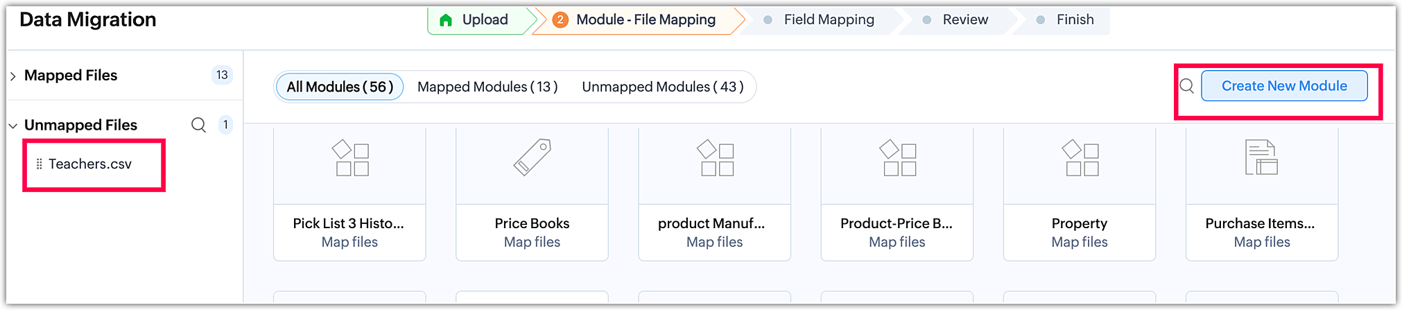 During the module mapping process, if there are any custom modules you need to create (e.g., "Teachers"), you can do so directly. Simply click on the Create Module option located in the top-left corner while in the module mapping interface. This allows you to efficiently create any required custom modules as you proceed with the mapping process.
